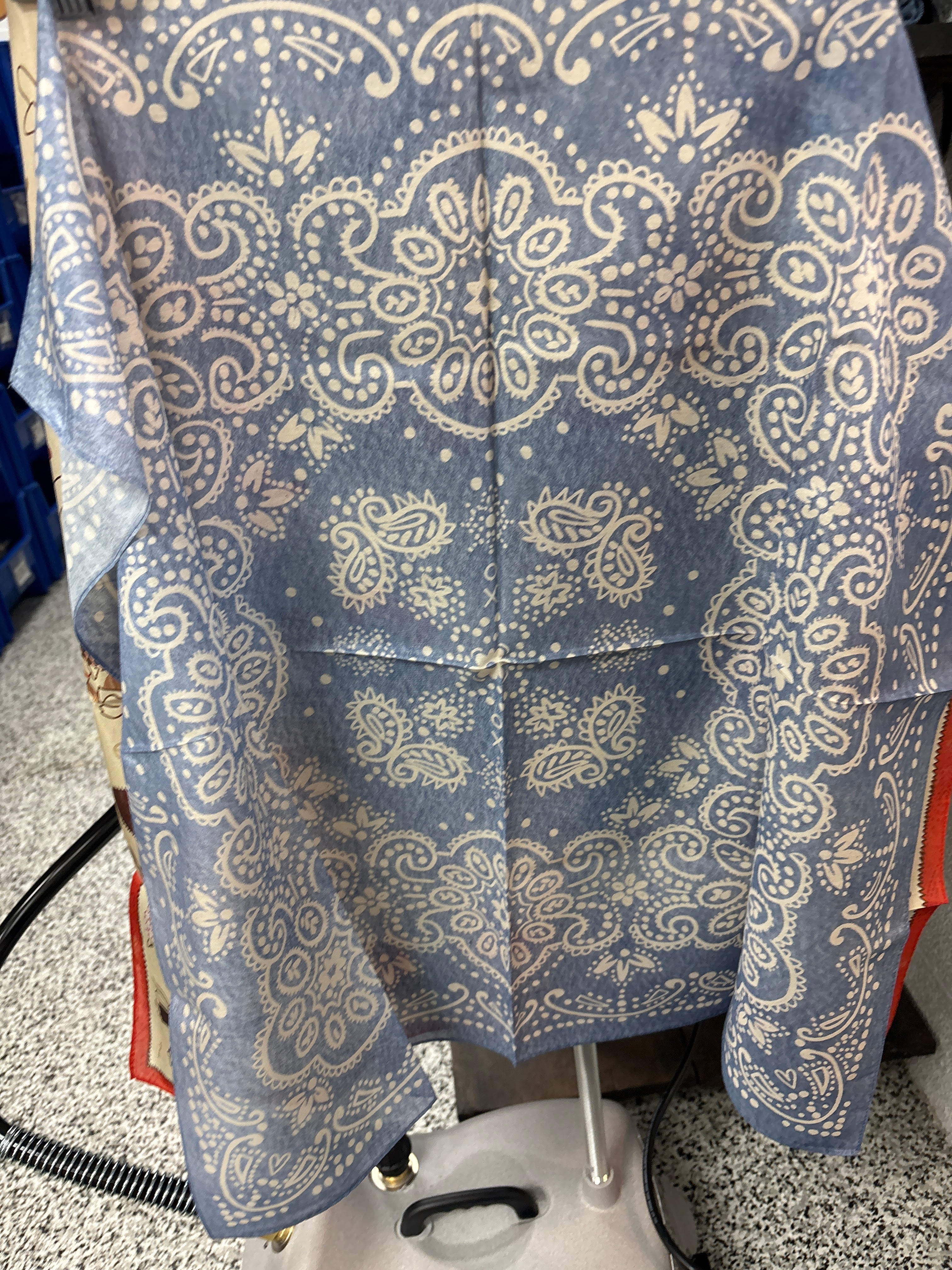 Add a touch of classic Western charm to your fall wardrobe with the Cowboy Blues Wild Rag. This 26x26 inch accessory features a delicate paisley print in soothing light blue tones, crafted from a luxurious blend of 70% cotton and 30% silk for soft comfort and lasting durability. Designed by XOXOart & Co., it offers the perfect blend of style and function, ideal for layering or tying as a statement piece. Elevate your look with this versatile wild rag that celebrates timeless Western heritage with a modern twist.
