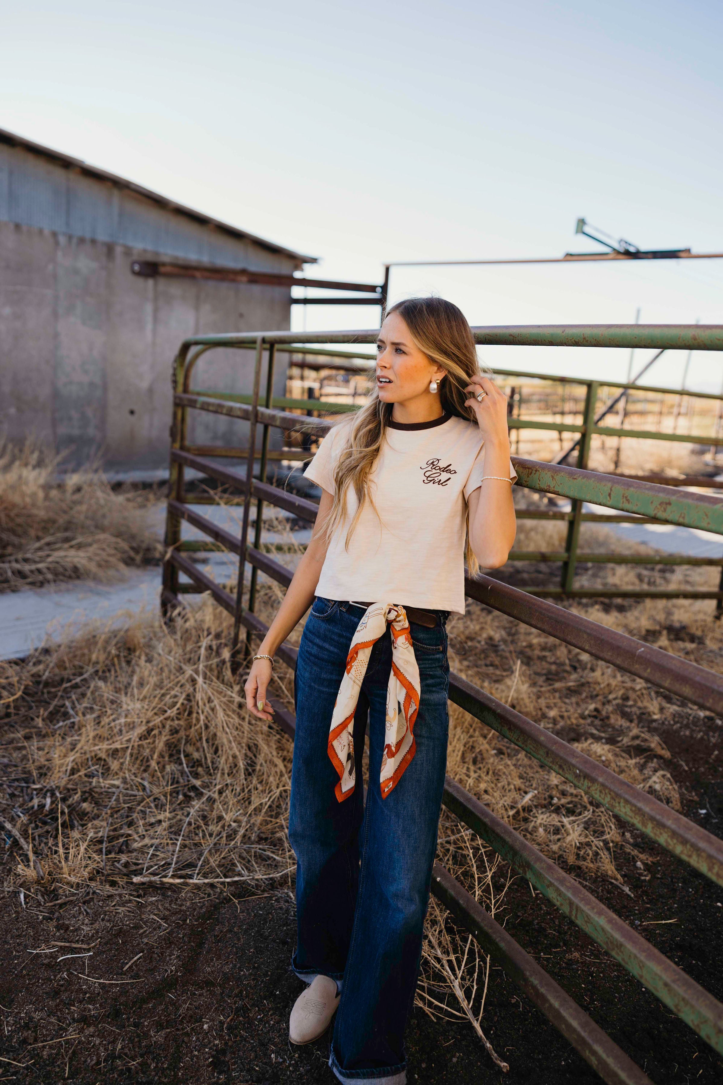Embrace fall vibes with the Rodeo Girl Tee, featuring a cozy oatmeal fabric and a relaxed fit with a cropped length. The brown hem neckline and playful "RODEO GIRL" embroidered print add a western flair, while the baby graphic keeps it fun and fresh. Perfect for those laid-back days with a touch of country charm.