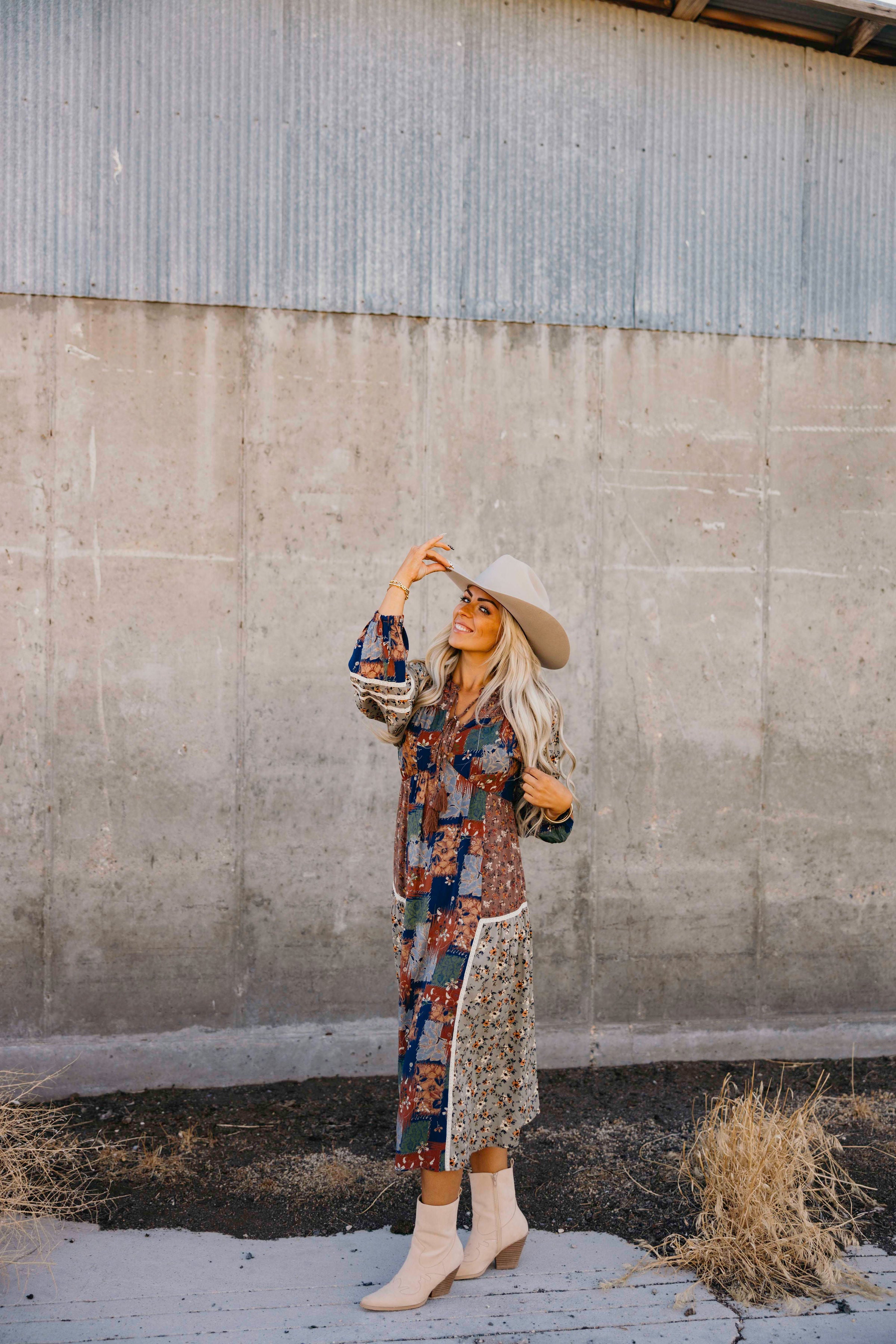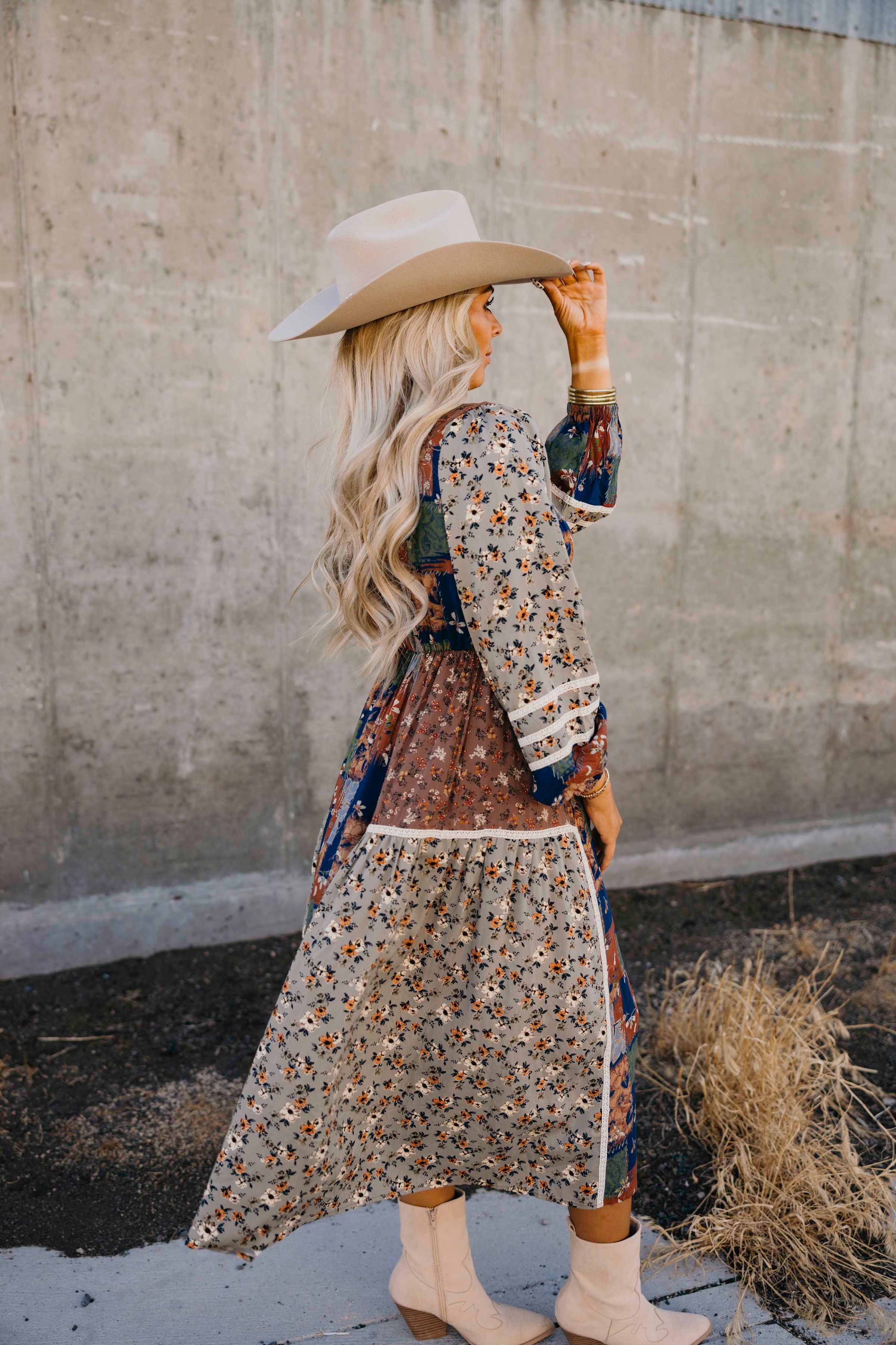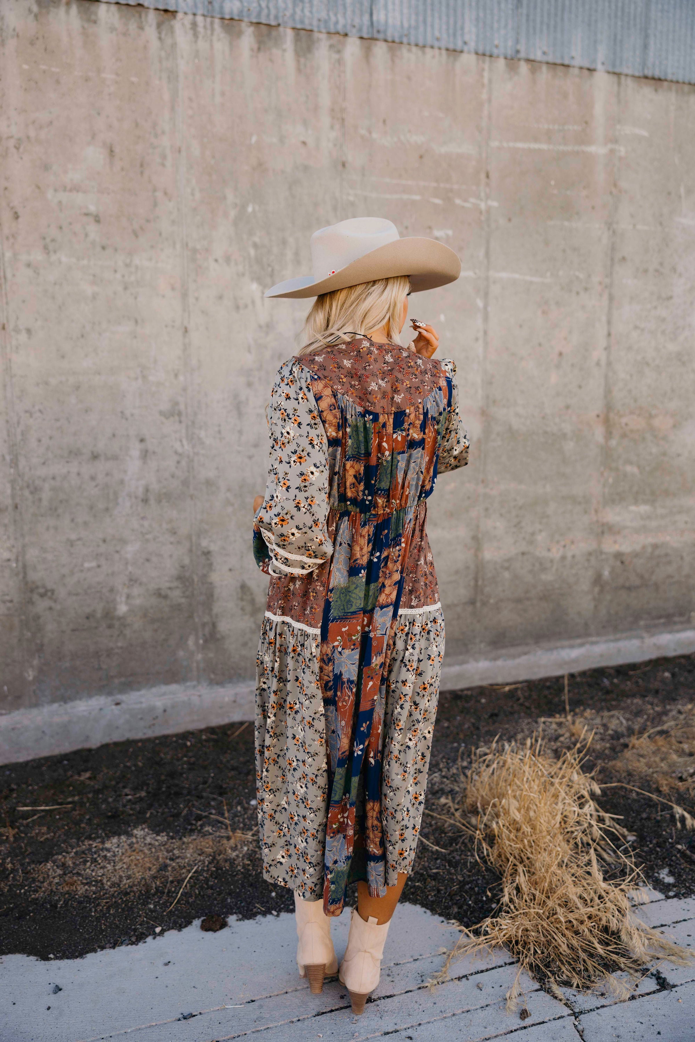 Step into playful elegance with the Winona Dress, featuring a charming mixed floral patchwork design and delicate lace trim. Its high ruffled neckline and notched V with tying tassels add a flirty touch, while long puff sleeves with elastic cuffs blend comfort with style. Perfect for twirling through your day or evening, this midi dress is your new go-to for effortless, whimsical flair.