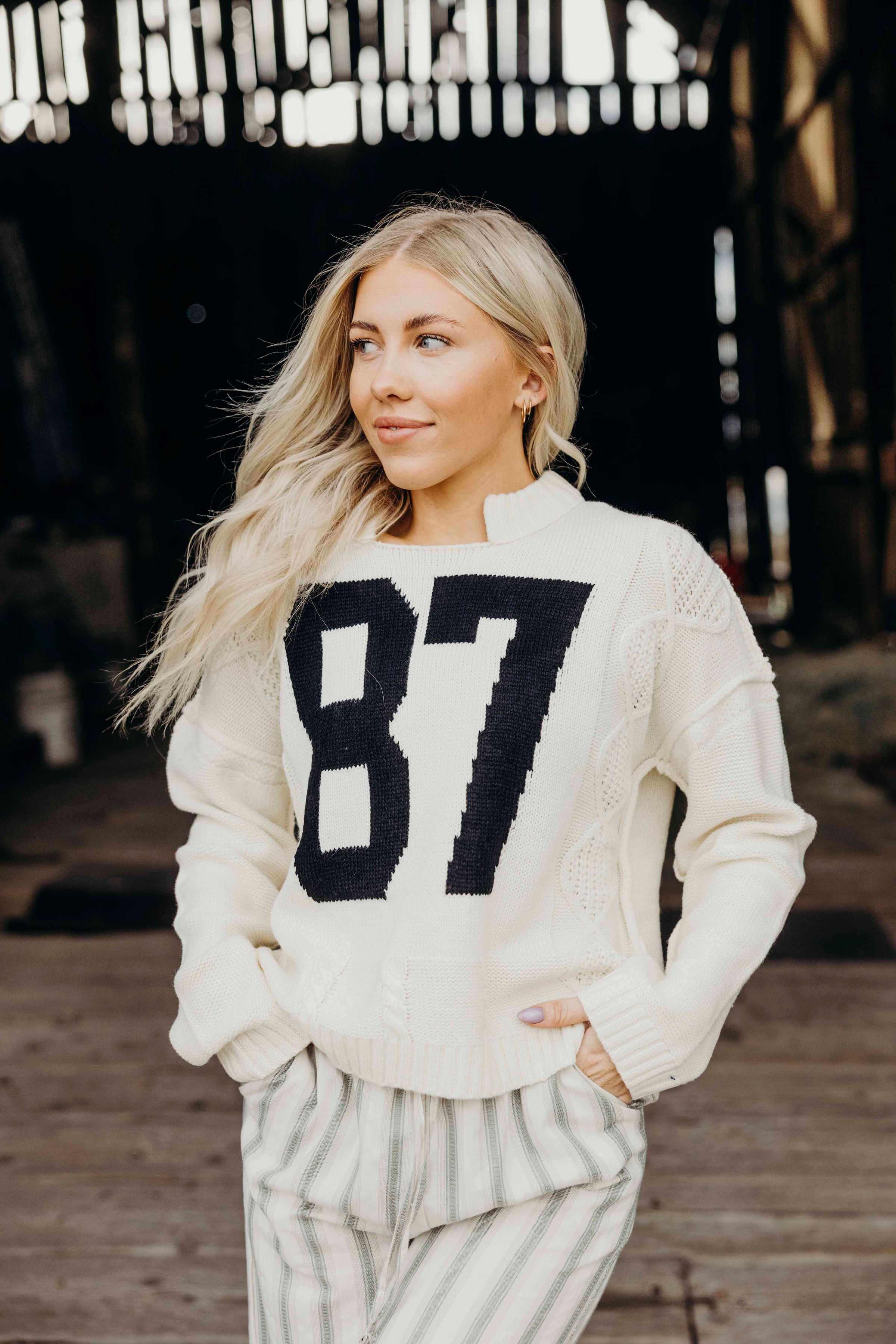 Embrace timeless style with the Grace Sweater in a warm oatmeal shade. Featuring vintage-inspired numbering "87," this cozy knit adds a nostalgic touch to your wardrobe while keeping you comfortably stylish. Perfect for layering, it blends classic charm with modern comfort for everyday wear.