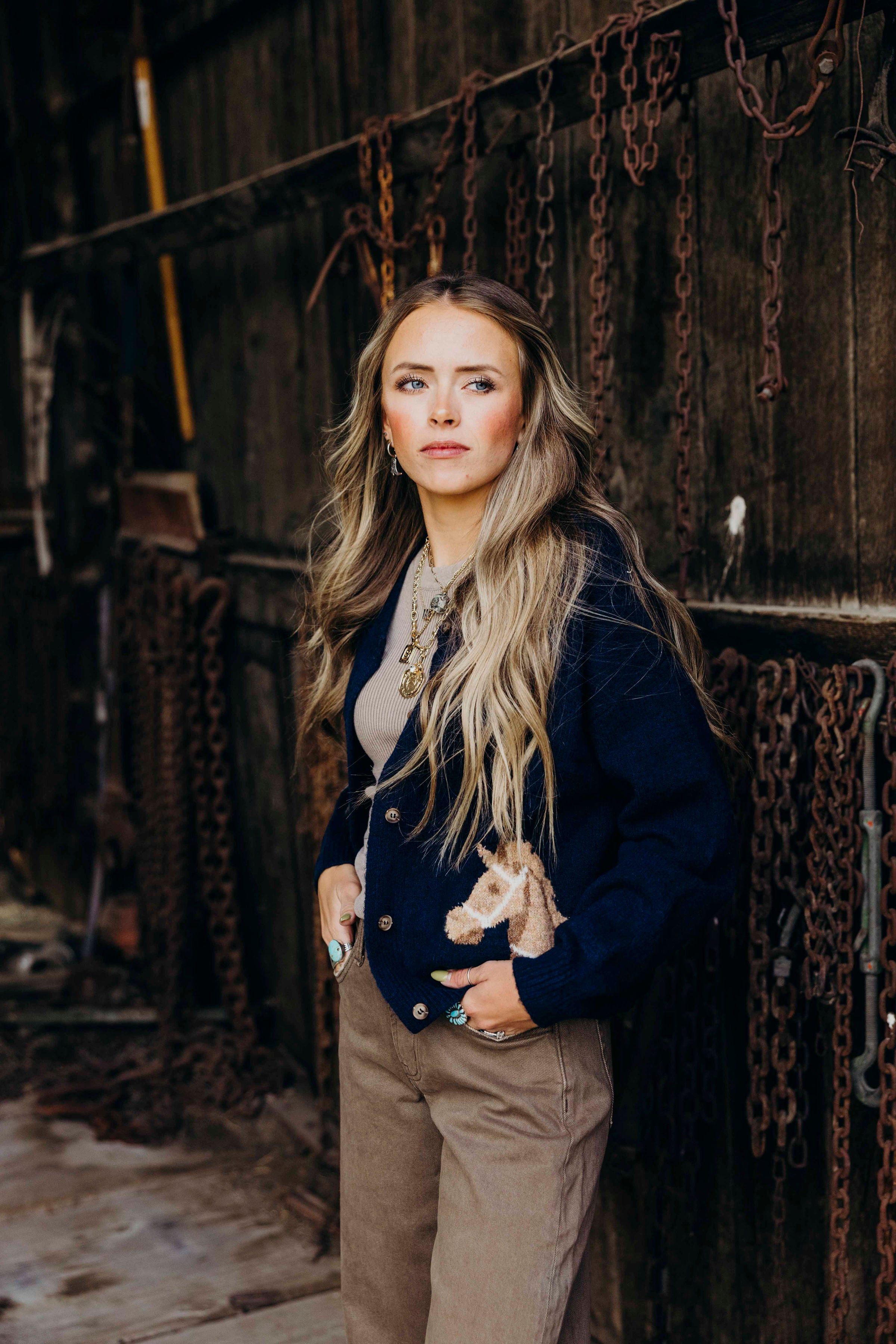 Embrace cozy fall days in the Luella Cardigan, featuring a charming horse print on a rich navy background. This long-sleeve western-inspired piece combines softness and warmth, making it perfect for layering during cooler weather. Its inviting texture ensures comfort from morning to evening, while the unique design adds a stylish touch to your seasonal wardrobe.