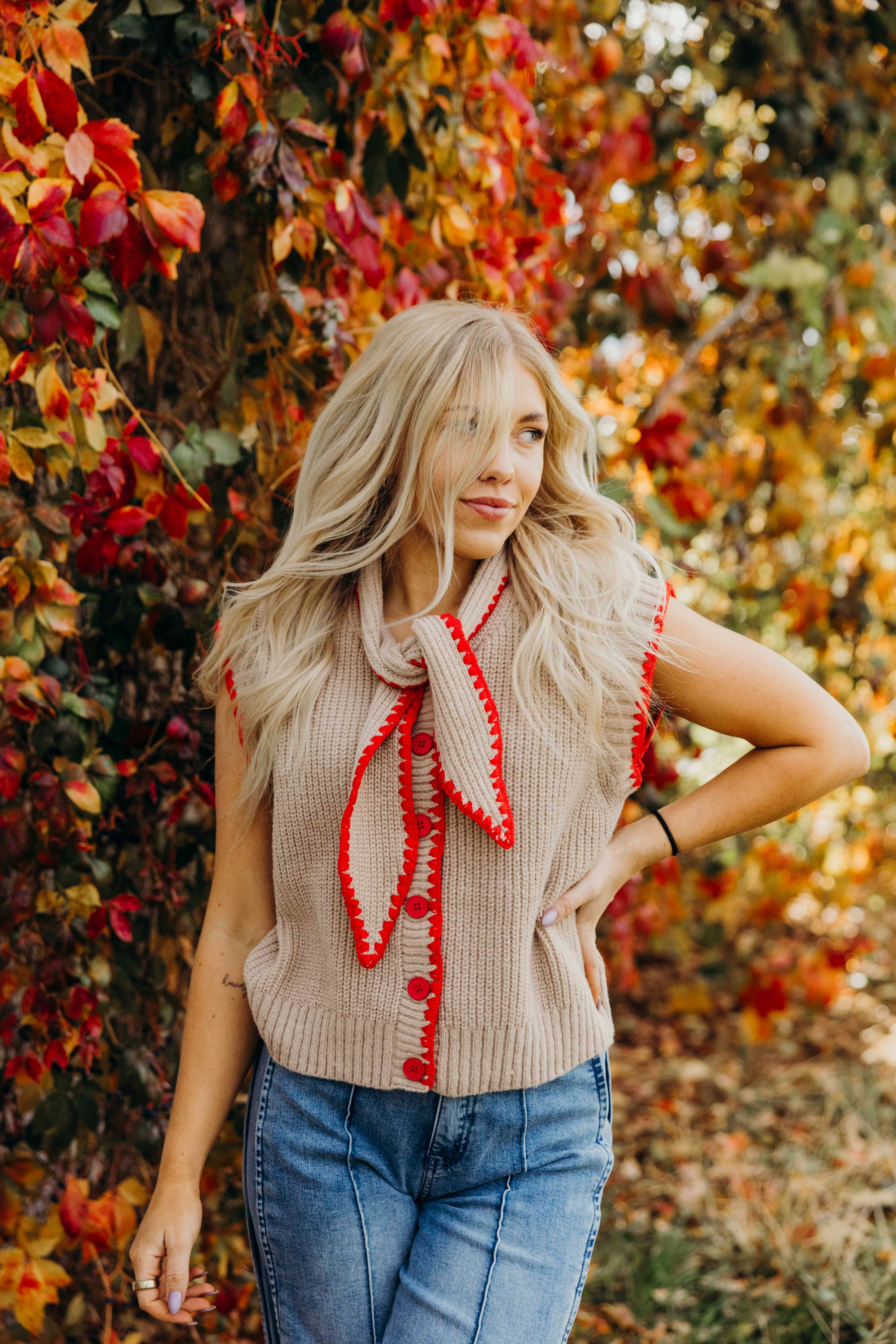 Elevate your casual look with The Oaken Vest, a playful take on western style in warm mocha and red. This sleeveless sweater vest features a tying neckline and button-down placket, adding fun and versatility to your outfit. The relaxed bodice ensures comfort, while the bold contrast red triangle stitching on the neckline, placket, and armholes gives it a unique, eye-catching twist. Perfect for layering or wearing on its own, this vest brings a charming rustic flair with a modern, spirited edge.