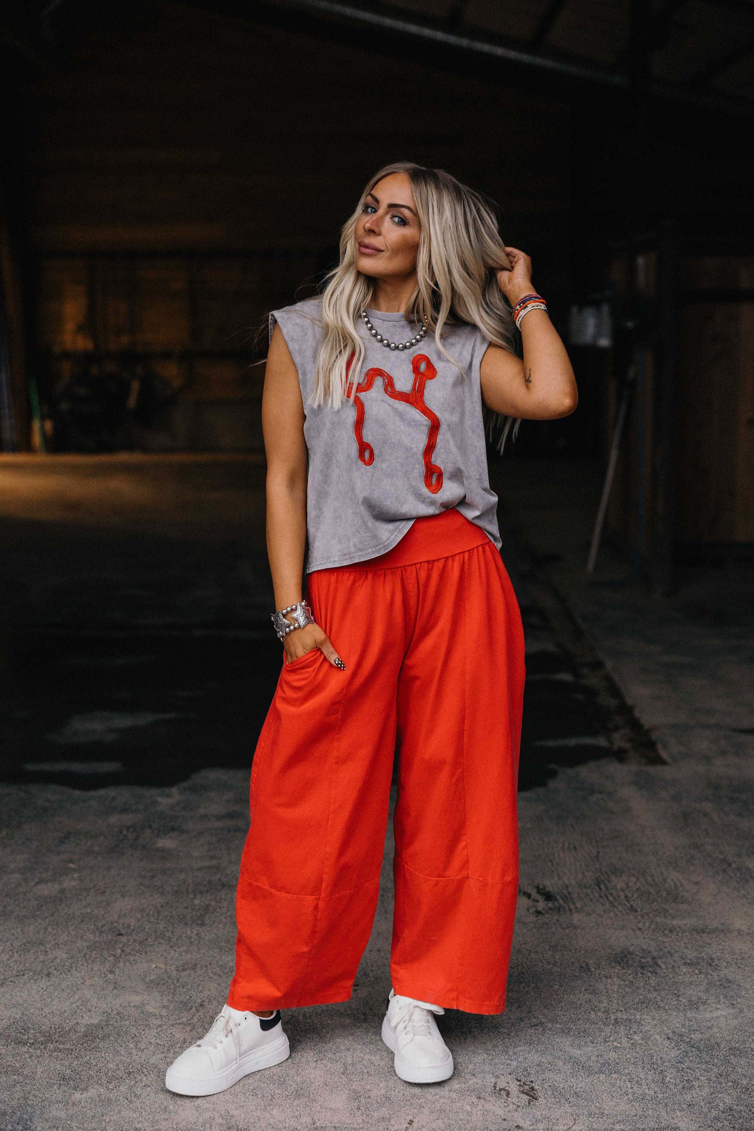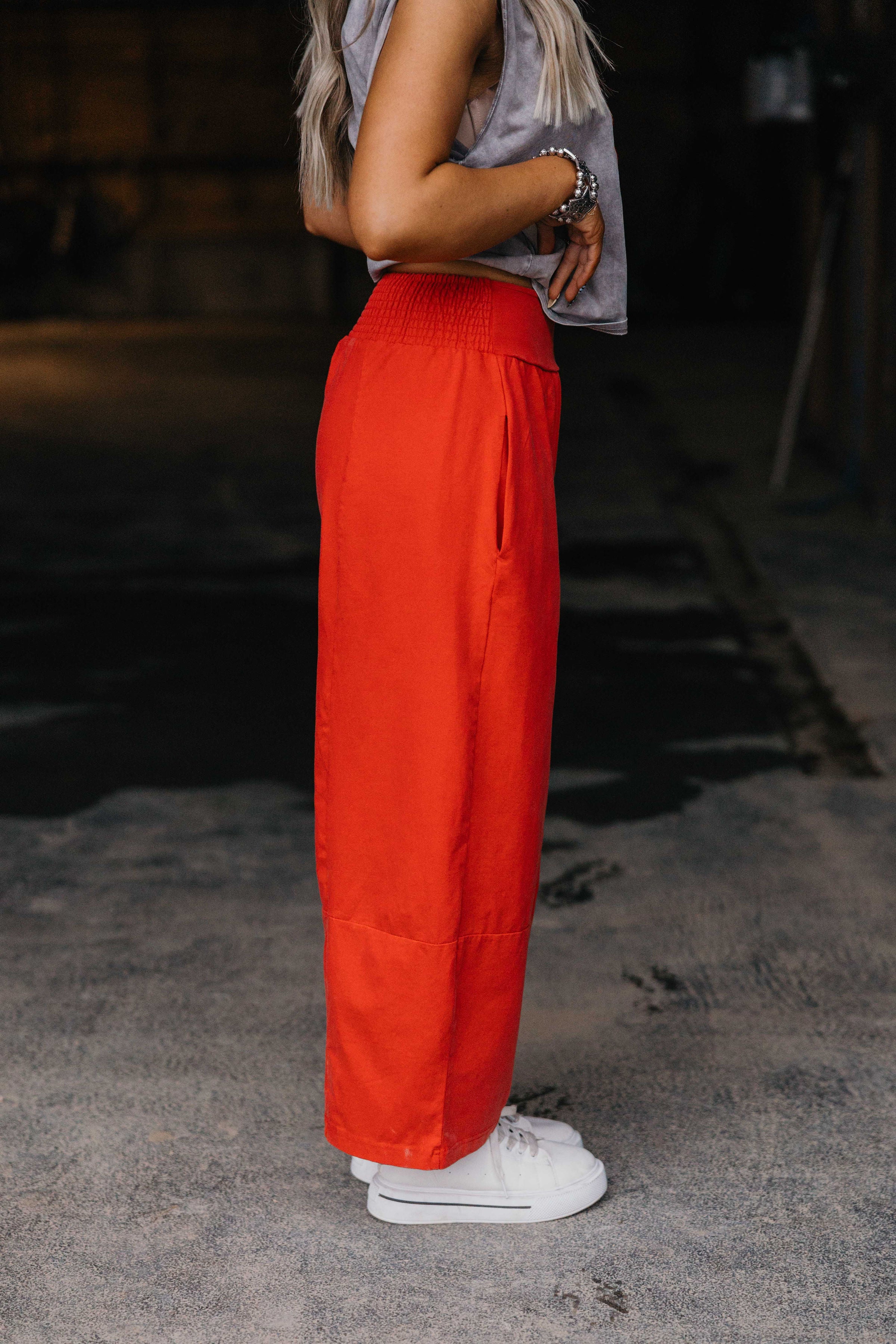 The Banks Pants deliver effortless style and comfort in one versatile piece. Crafted in a rich red mineral wash, these wide leg pants feature a generously smocked waistband that moves with you for all day ease. The relaxed silhouette works equally well for cozy lounging or dressed up with heels and a blazer for an elevated look. Perfect for anyone seeking comfort without compromising on style.