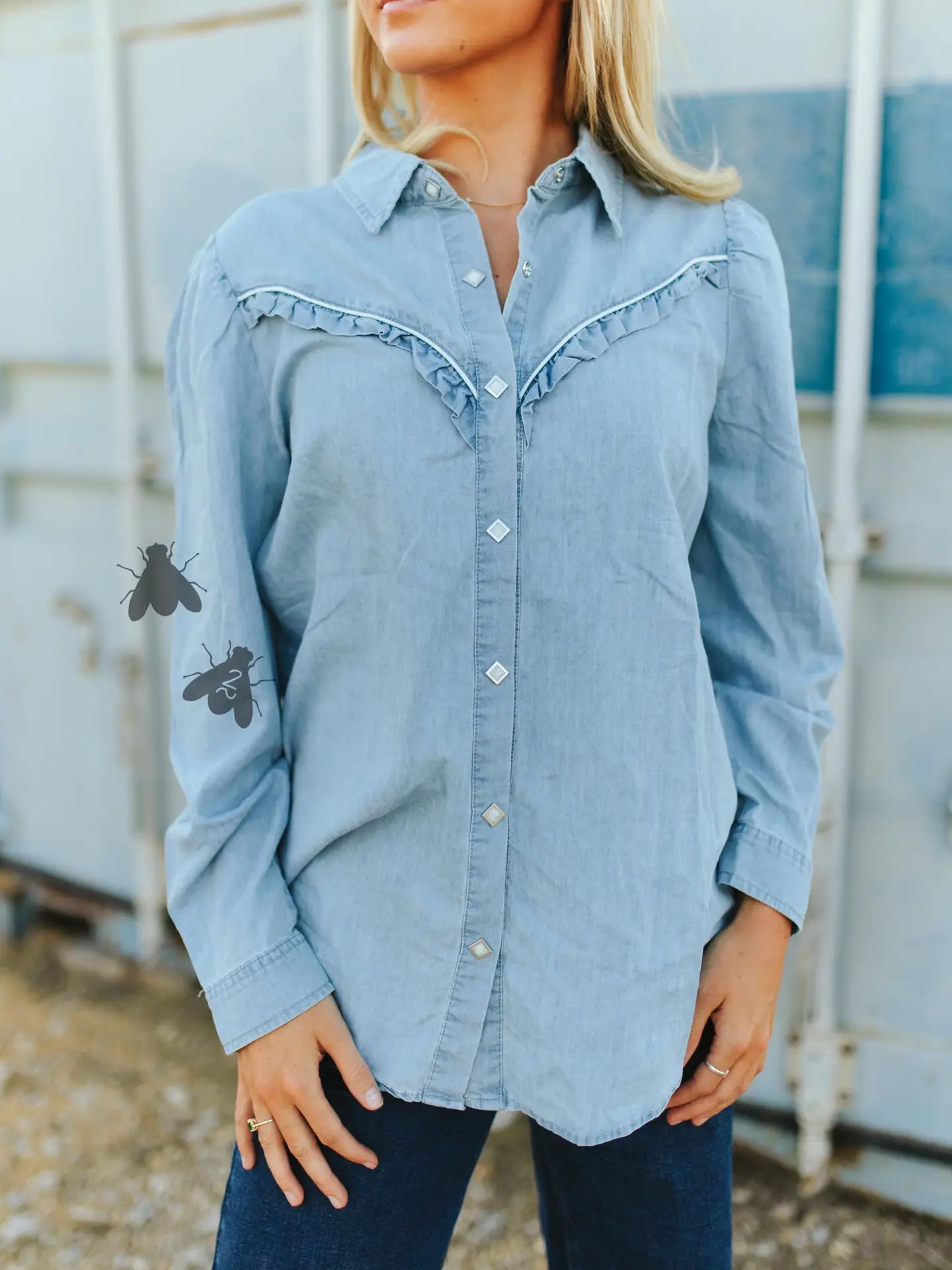Bring bold western charm to chilly days with The Rowdy Shirt. This playful denim button-down features a ruffle yoke and classic collar, blending rugged style with a flirty twist. Its long sleeves keep you cozy while you channel that NFR spirit all winter long. Perfect for those who love a little sass with their warmth.