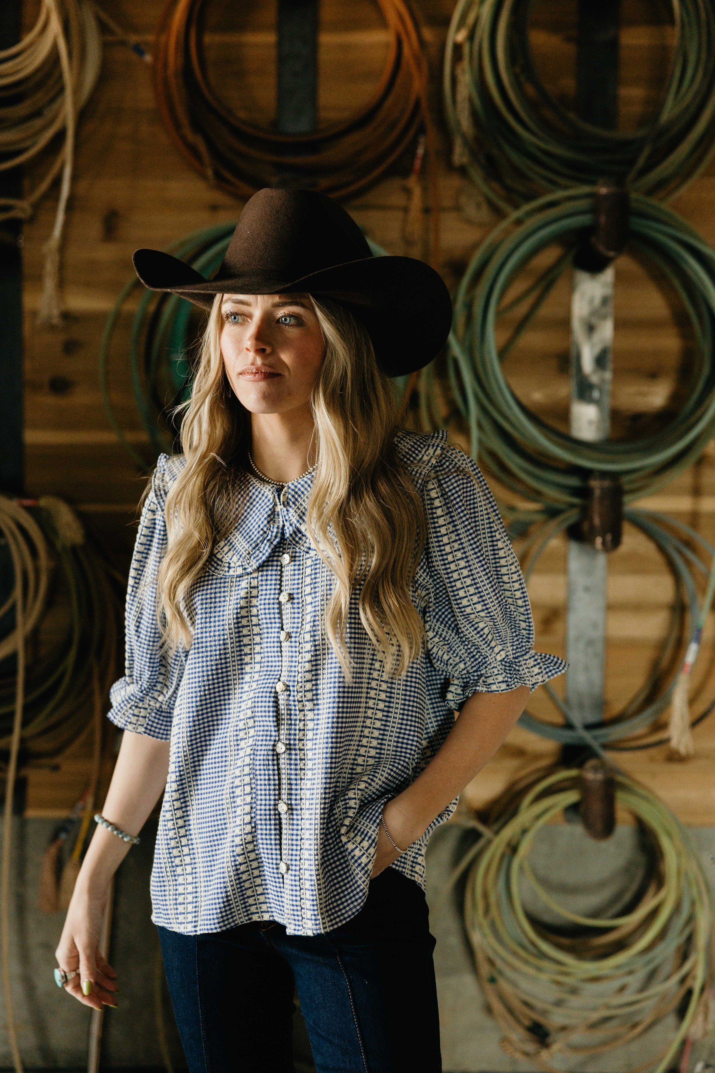 The Sadie Blouse is pure Western whimsy. This charming blue gingham print pairs perfectly with a sweet peter pan collar that adds a touch of vintage flair. Short puff sleeves frame the shoulders with playful volume, while the button down front keeps things practical and easy to style. Whether you're heading to the ranch or a casual weekend brunch, this blouse delivers that signature Western aesthetic with a fun, feminine edge.