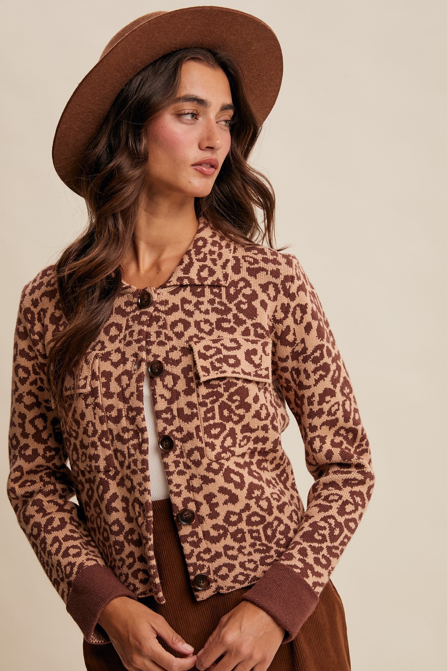 Get cozy with The Sorina Jacket, your new go-to mocha cardigan with a wild twist. This medium-weight knit features a bold leopard print and a slightly cropped cut that keeps things fun and flattering. Button up the front and stash your essentials in the functional flap chest pockets. With full-length sleeves, a classic collar, and contrasting knit cuffs, this piece is perfect for adding a playful edge to your winter wardrobe.