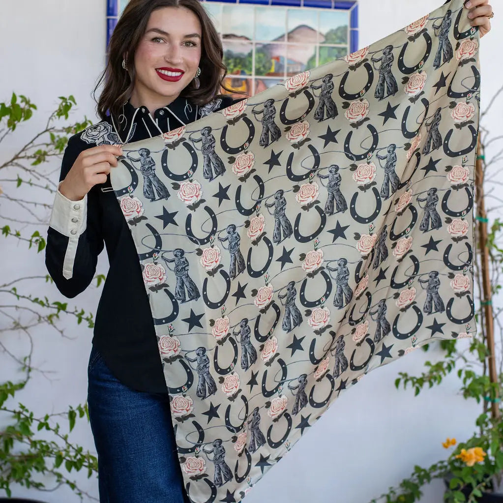 Bring a dash of western charm to your winter style with Johnny’s Rosie Wild Rag. This 35"x35" wild rag features a playful tan backdrop adorned with roses, cowboys, and horseshoes, capturing the spirit of the rodeo and the NFR. Made from 100% polyester, it’s cozy and perfect for chilly days, wrapping you in warmth and style wherever the trail leads.
