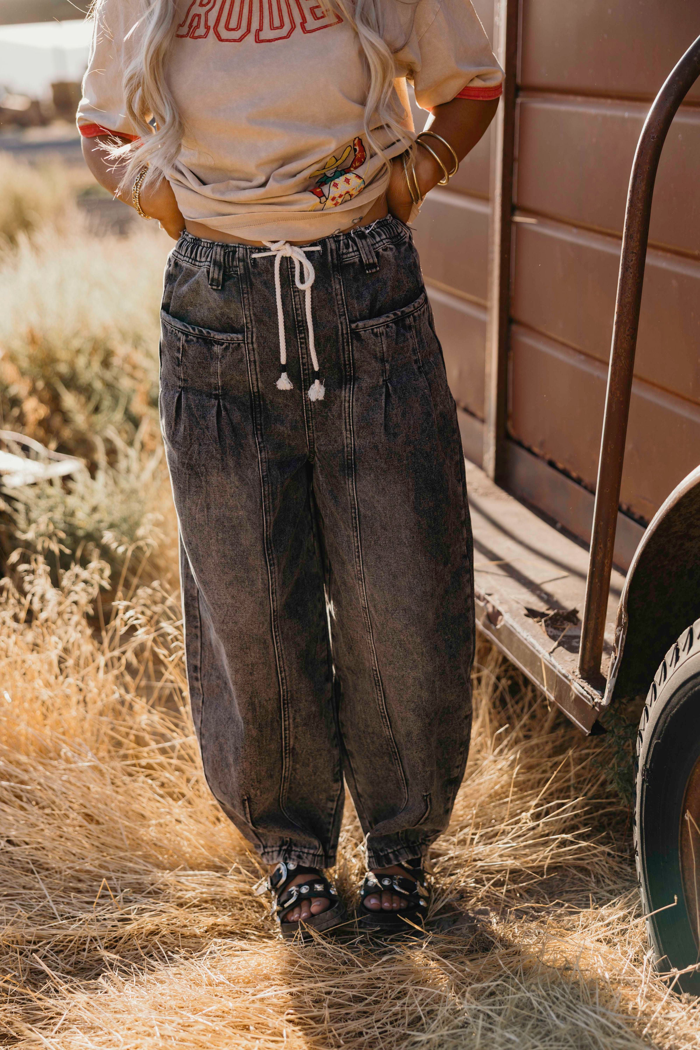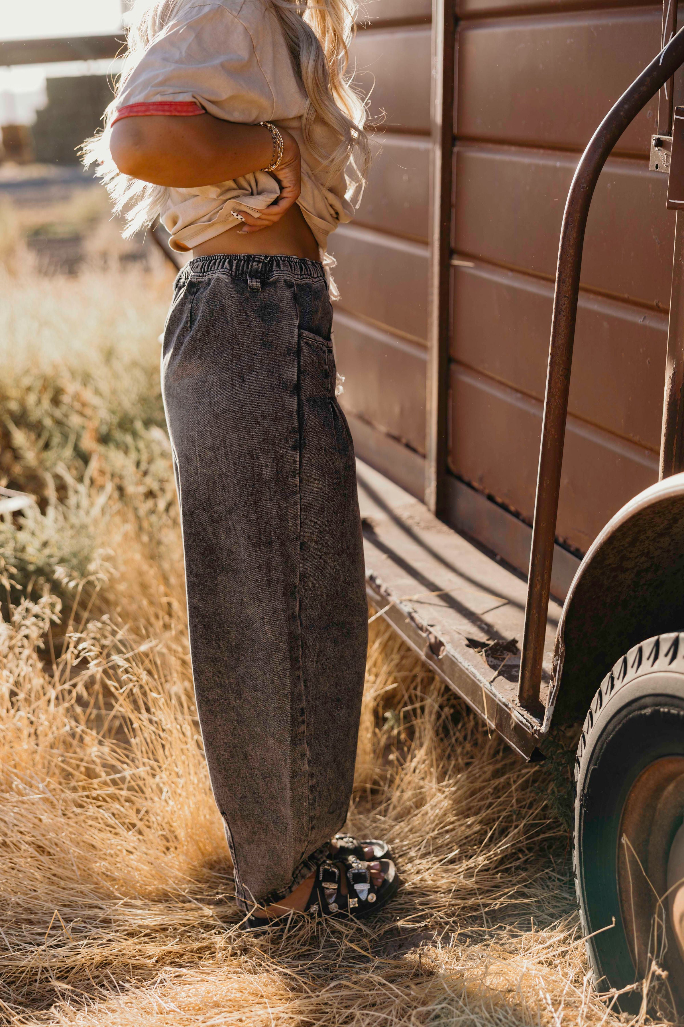Step into effortless style with the Hester Pants. Featuring a grey washed denim look and playful barrel leg silhouette, these pants boast pleated details for added flair. The elastic back waist with drawstring offers a comfy, customizable fit, while side pockets keep your essentials close. Perfect for days when you want to look cool and feel relaxed all at once!