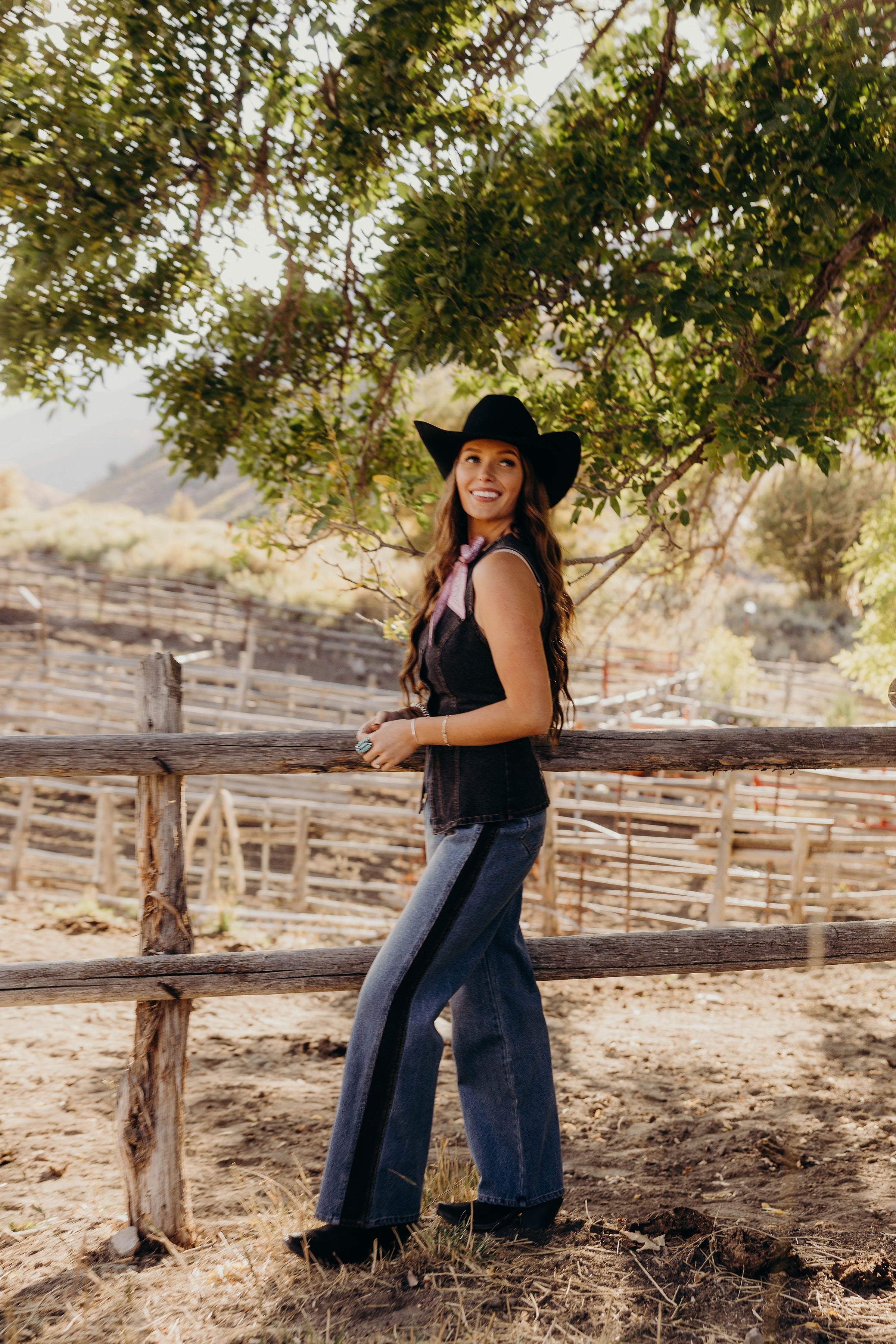 Embrace the spirit of Vegas nights and the NFR with the Midnight Rider Vest. Crafted from washed black denim, this western-inspired fitted vest features a sleek button-down front and sleeveless design, perfect for layering through winter evenings. Its tailored fit offers a sharp, confident look that pairs effortlessly with your favorite cowboy boots and jeans. Stay warm while making a bold statement in this essential vest designed for those who ride with style and attitude.