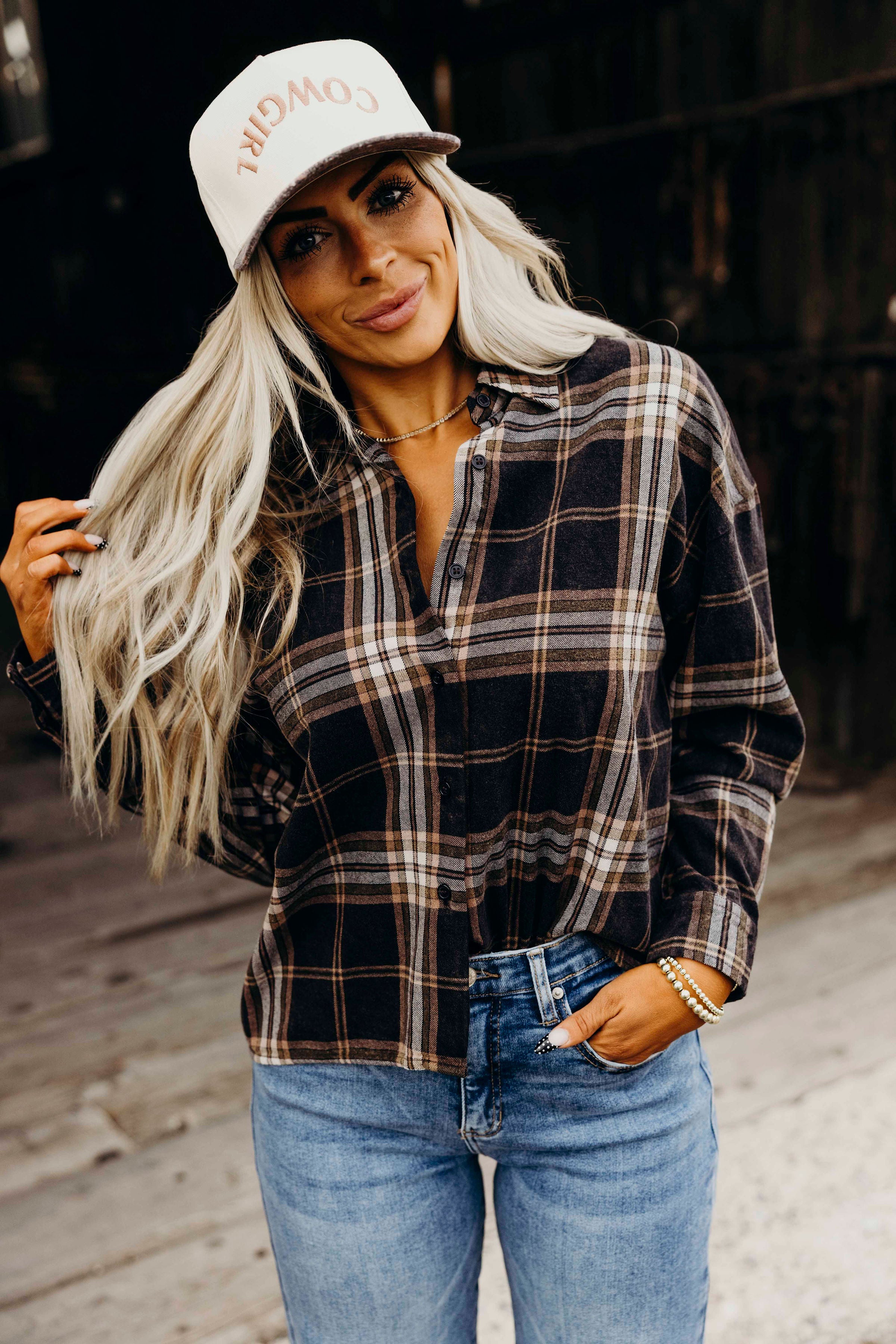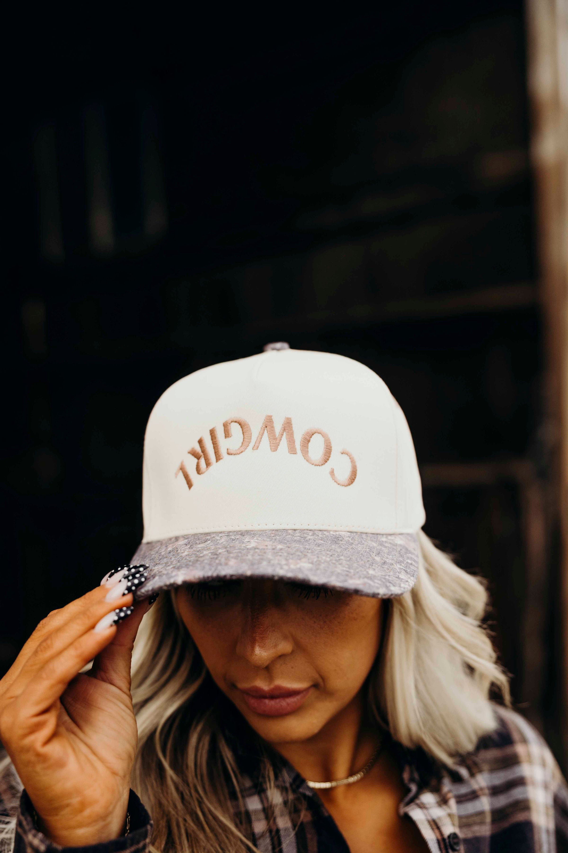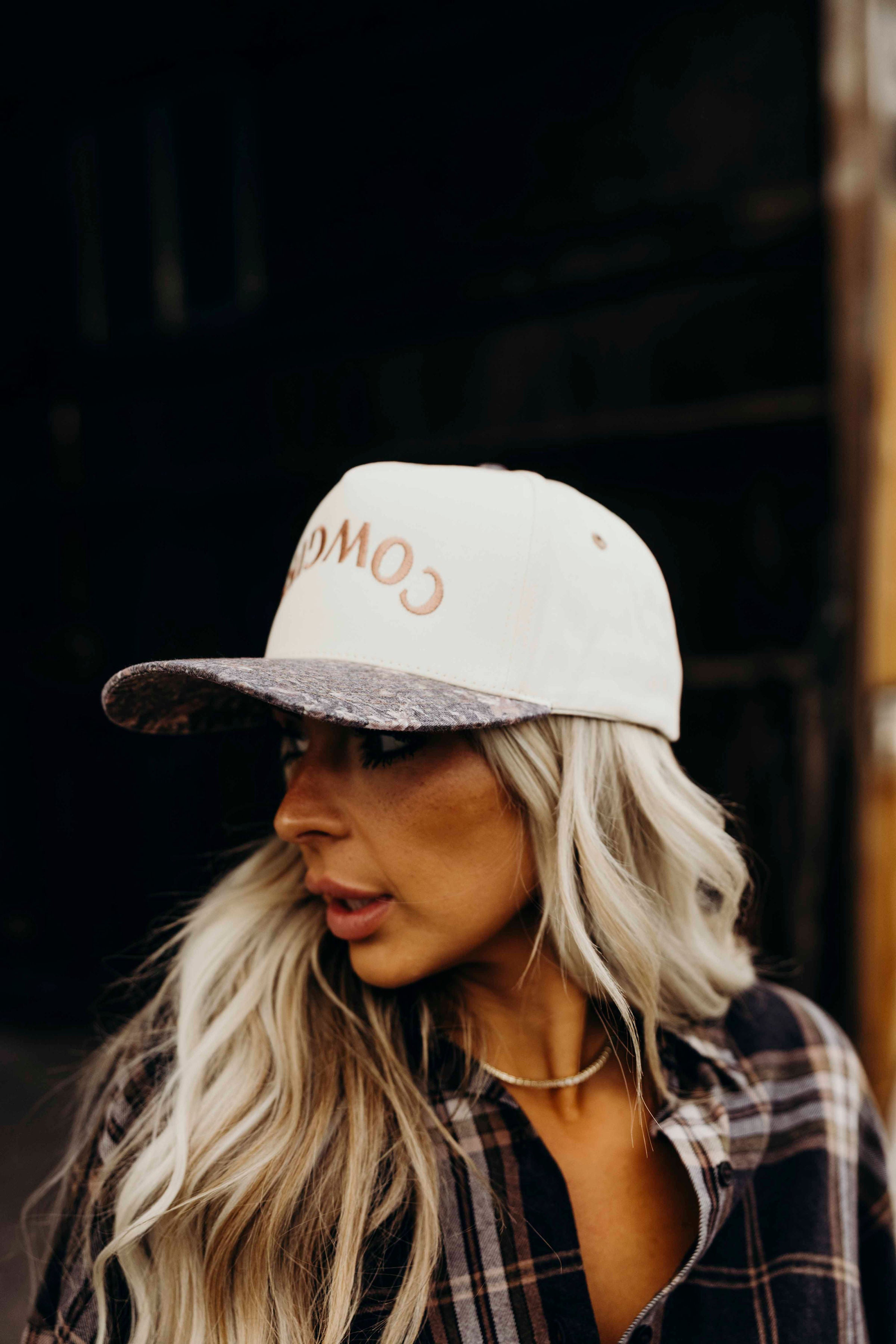 Show off your wild side this fall with the Outlaw Cowgirl Trucker. Featuring a cream camo print brim and a playful upside down "COWGIRL" print, this western style trucker hat adds a touch of bold attitude to any outfit. The adjustable snapback ensures a perfect fit, making it a fun and functional accessory designed by us just for you.