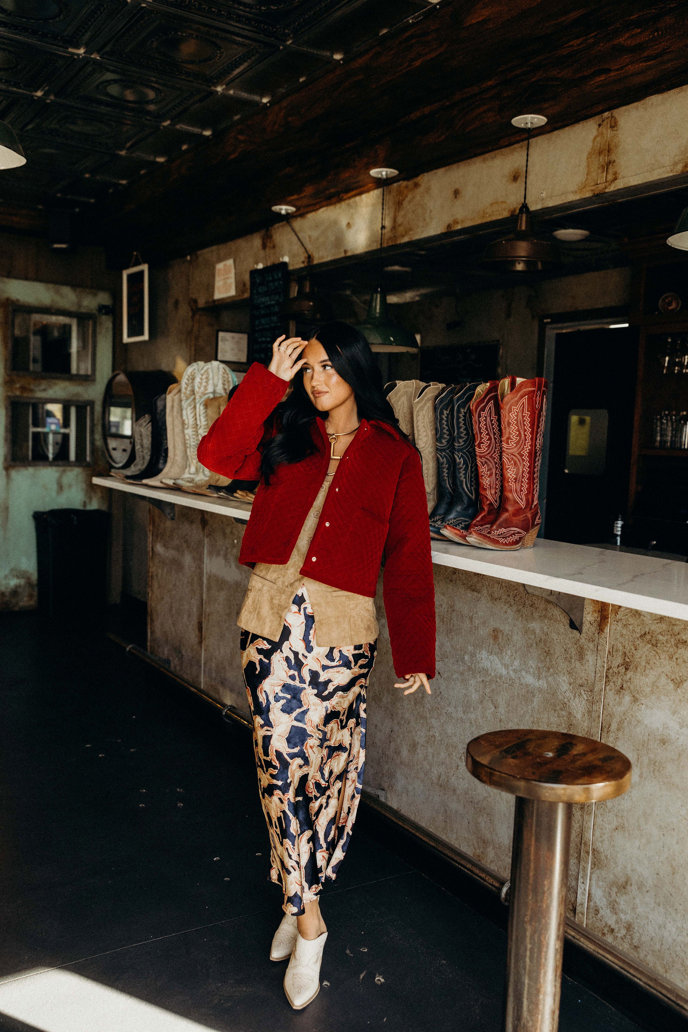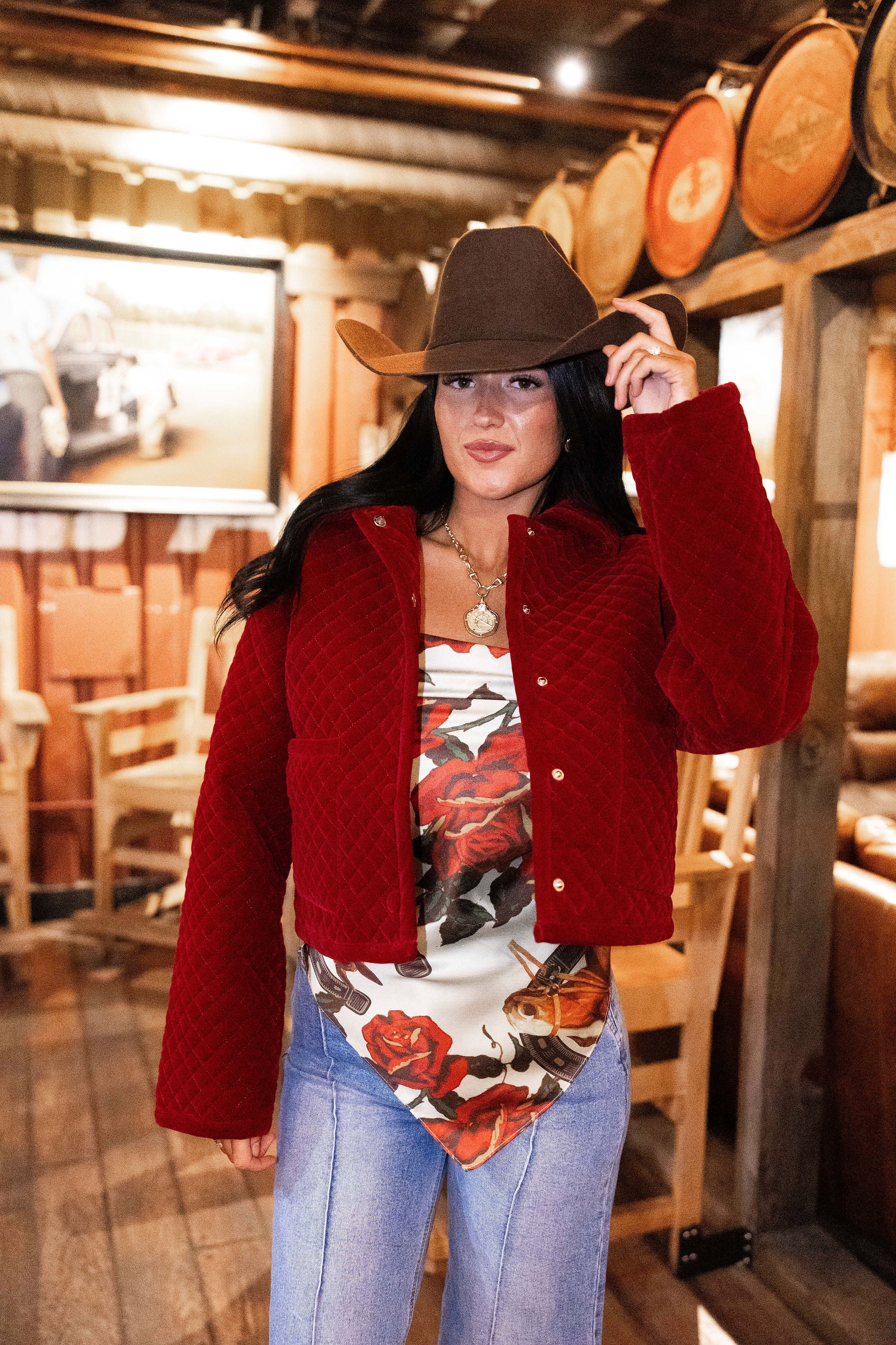 Stay warm and stylish this winter with The Ashford Jacket. This red quilted western jacket features a classic collar and button-down front, with a slightly cropped fit perfect for layering. Inspired by the vibrant energy of Vegas and the NFR, it’s a playful yet practical piece to brighten up chilly days.