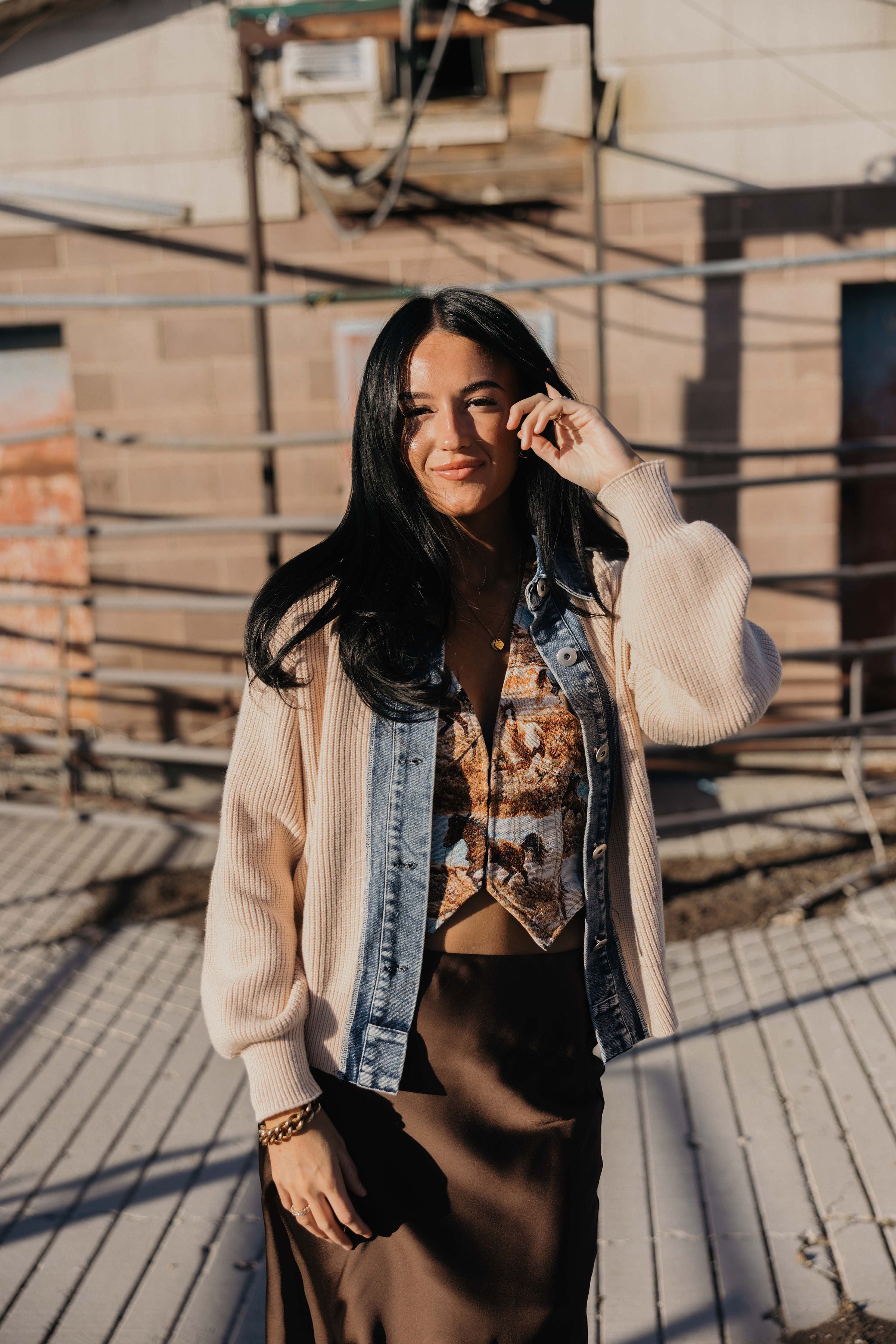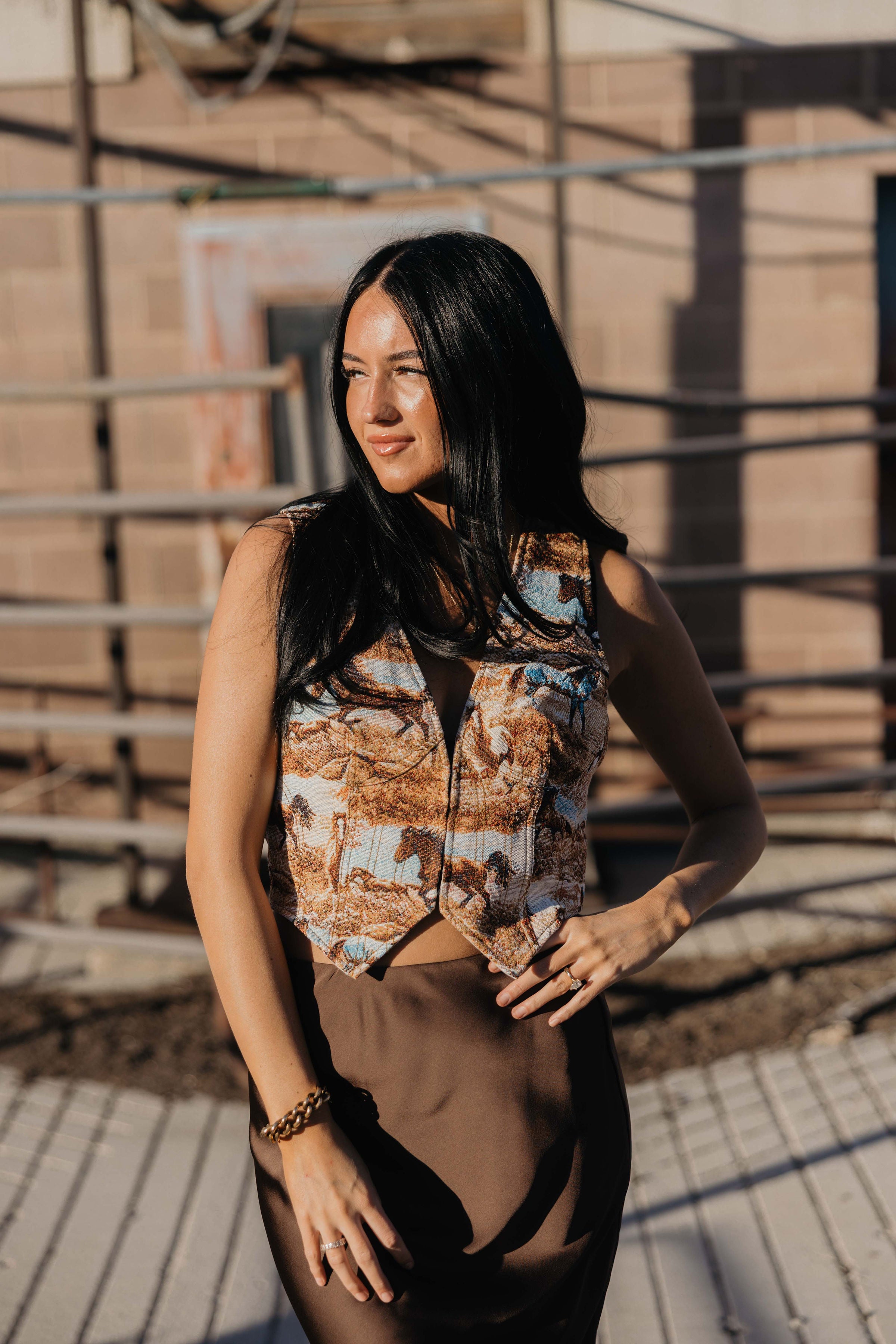 The Forra Vest combines a refined jacquard horse scene print with a structured fit and elegant V neckline, offering a sophisticated take on western style. Designed for layering, this winter vest provides warmth without sacrificing shape or detail, making it a perfect statement piece for cooler seasons.