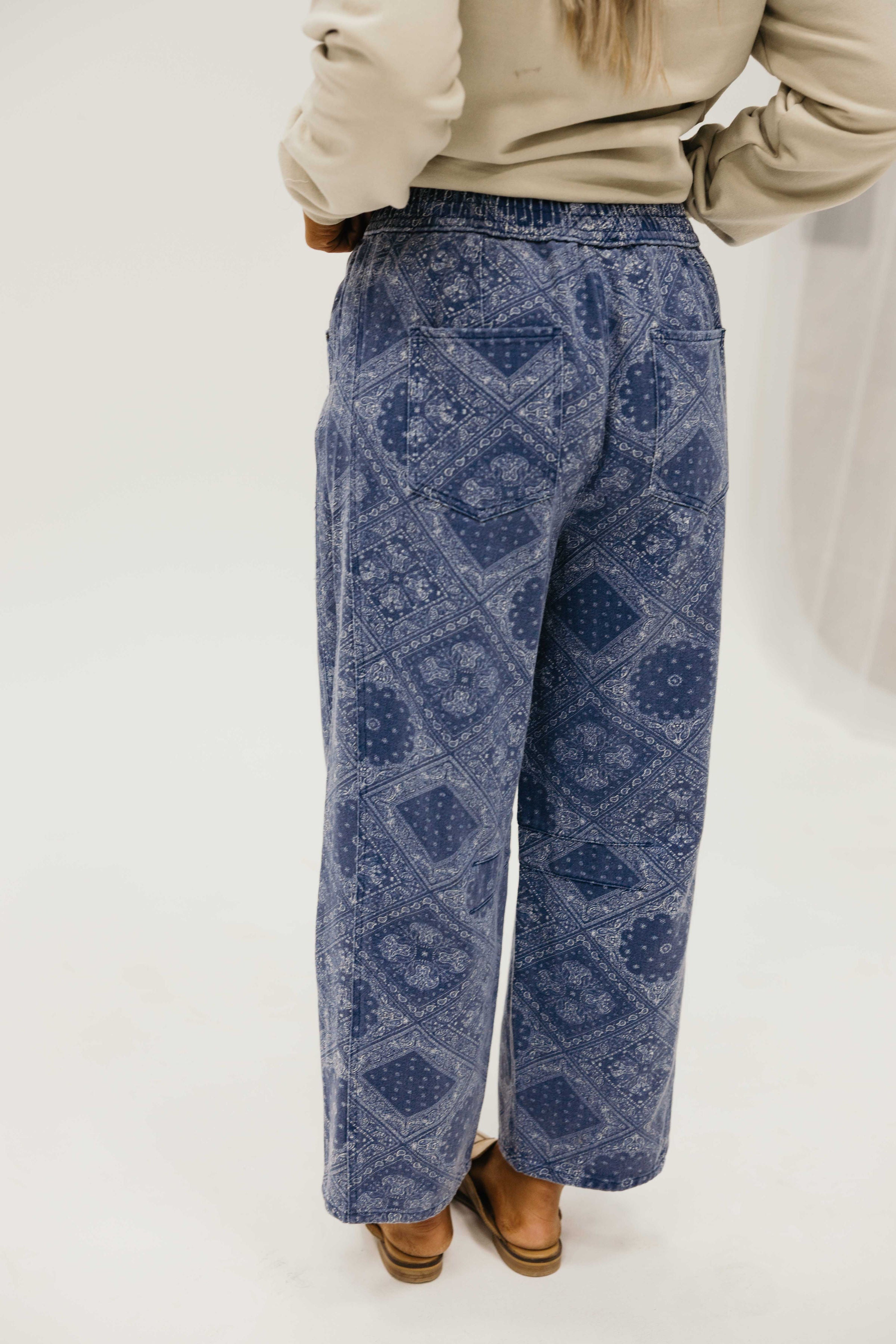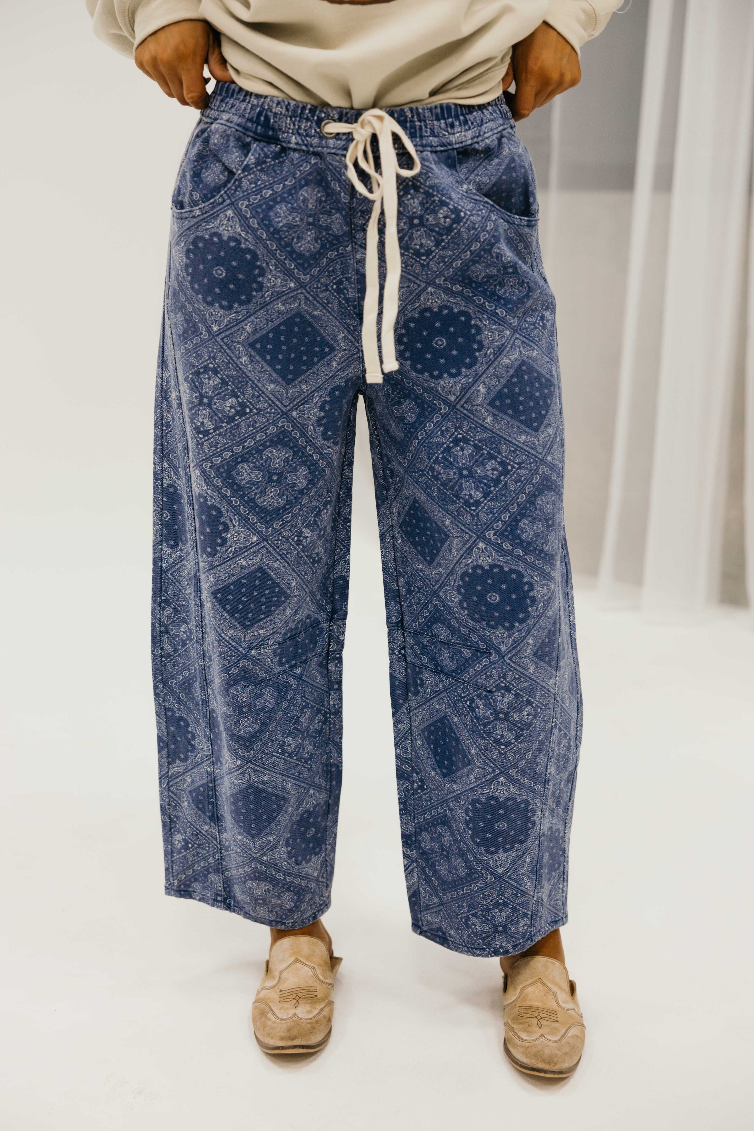 The Oakes Pants bring effortless style to your everyday wardrobe. Crafted in a rich navy with an eye catching paisley print, these western inspired pants feature a comfortable elastic waist with drawstring for an adjustable fit. The barrel silhouette creates a relaxed, flattering shape, while front and back pockets keep your essentials within reach. Cut to a perfect ankle length, they're versatile enough to dress up or down your new go-to for looking put-together with minimal effort.