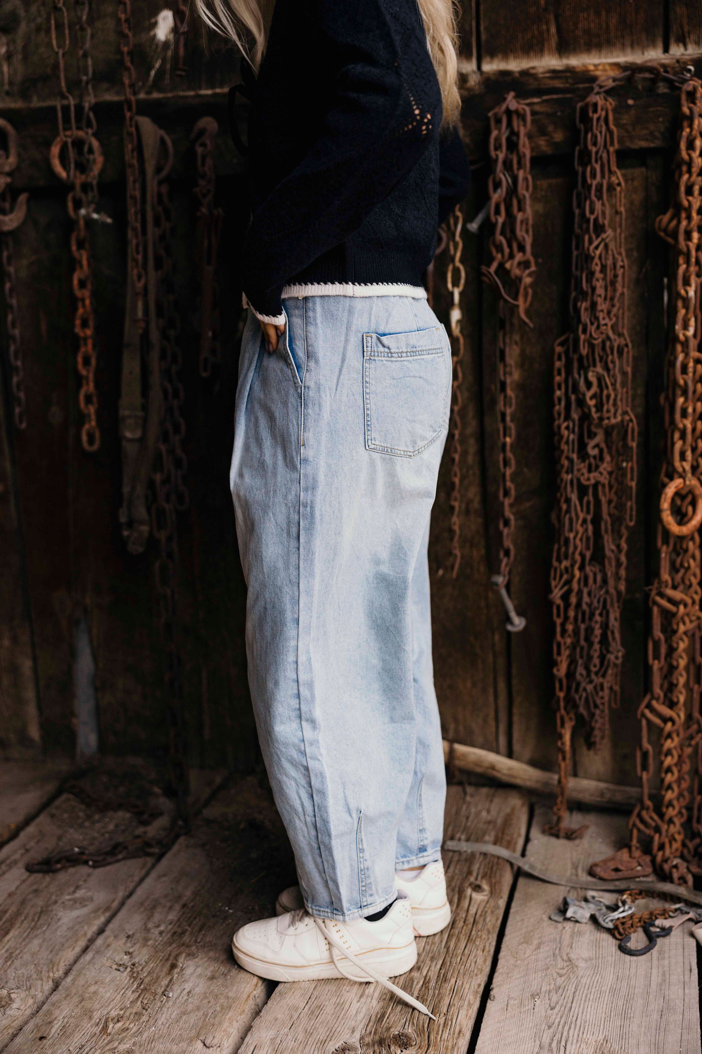 These denim cowgirl pants feature a unique pleat detail and a flattering barrel jean fit - perfect for any fall adventure. So leave the boring jeans behind and let your inner cowgirl shine with these playful pants!