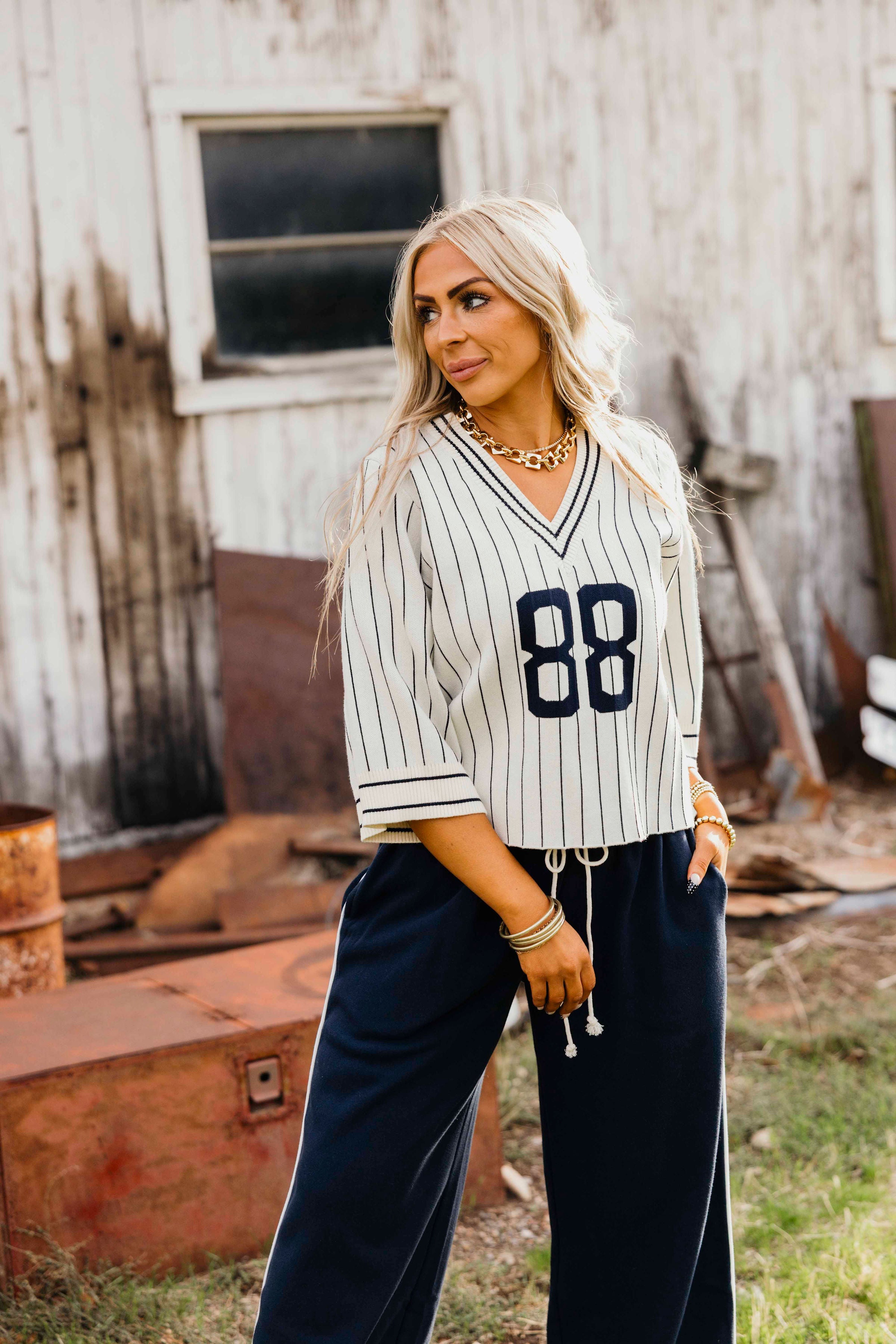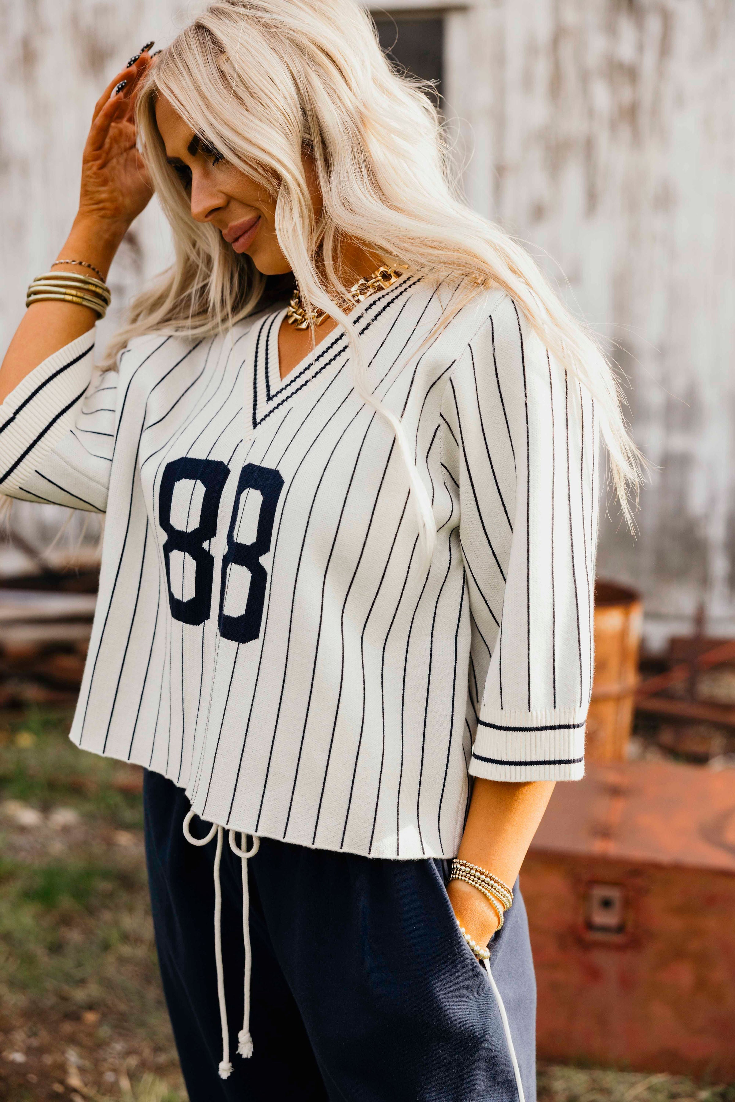 Bring retro vibes to your fall wardrobe with The Russet Sweater. This white sporty top features playful horizontal stripes and a flattering V neckline with a ribbed hemline. Its cropped, boxy silhouette offers a fun, laid back look that's perfect for layering or pairing with high waisted favorites on crisp autumn days.