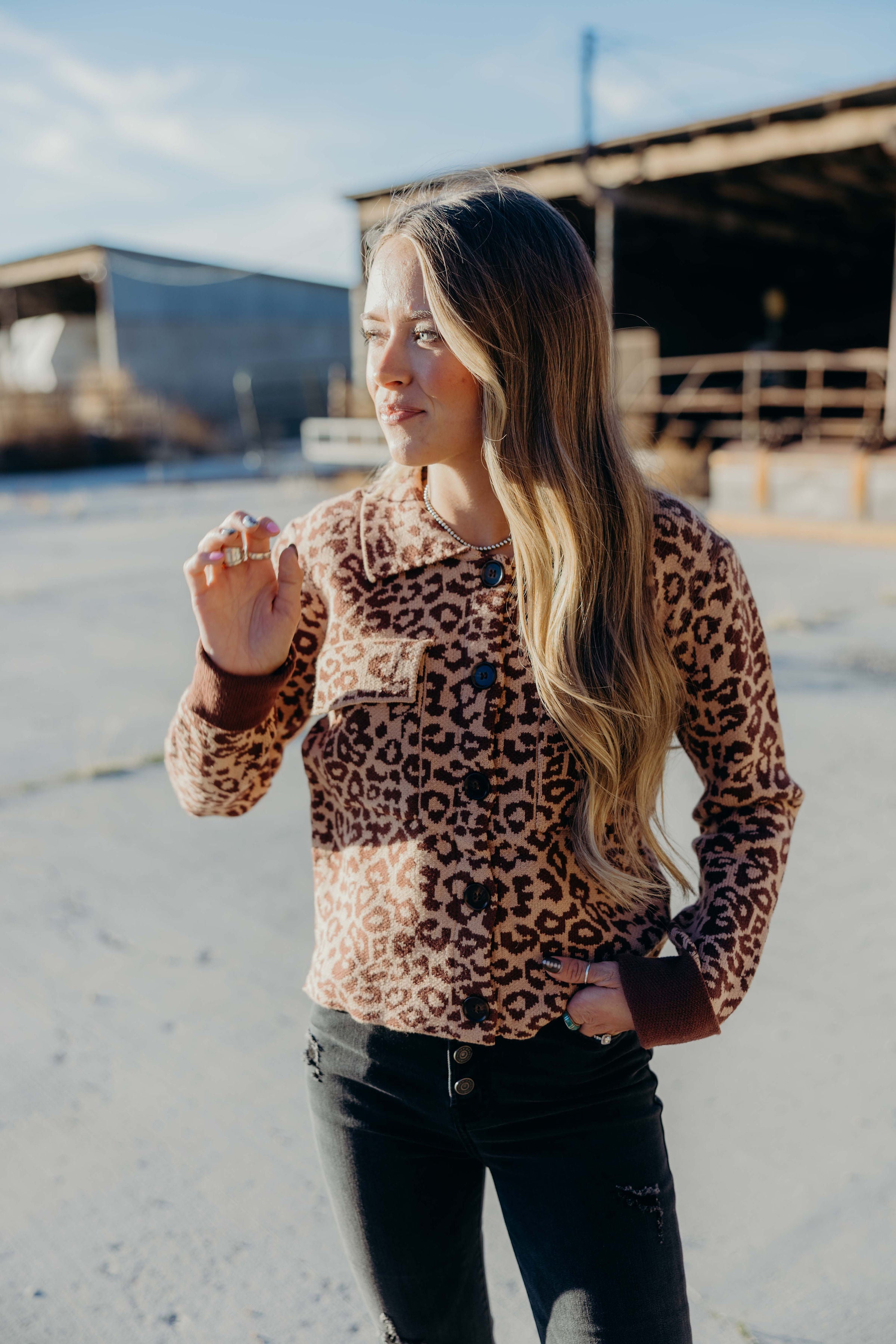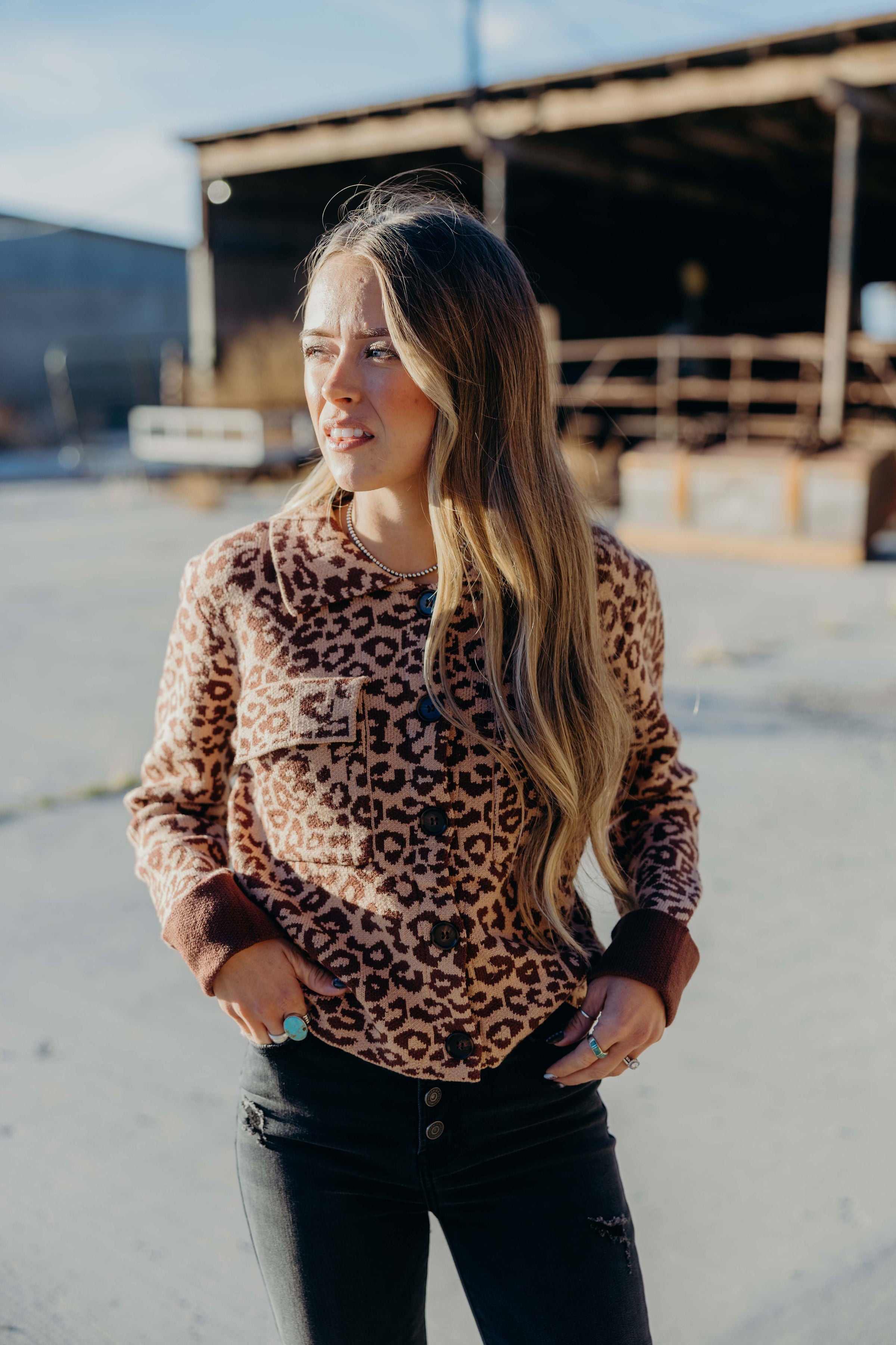 Get cozy with The Sorina Jacket, your new go-to mocha cardigan with a wild twist. This medium-weight knit features a bold leopard print and a slightly cropped cut that keeps things fun and flattering. Button up the front and stash your essentials in the functional flap chest pockets. With full-length sleeves, a classic collar, and contrasting knit cuffs, this piece is perfect for adding a playful edge to your winter wardrobe.