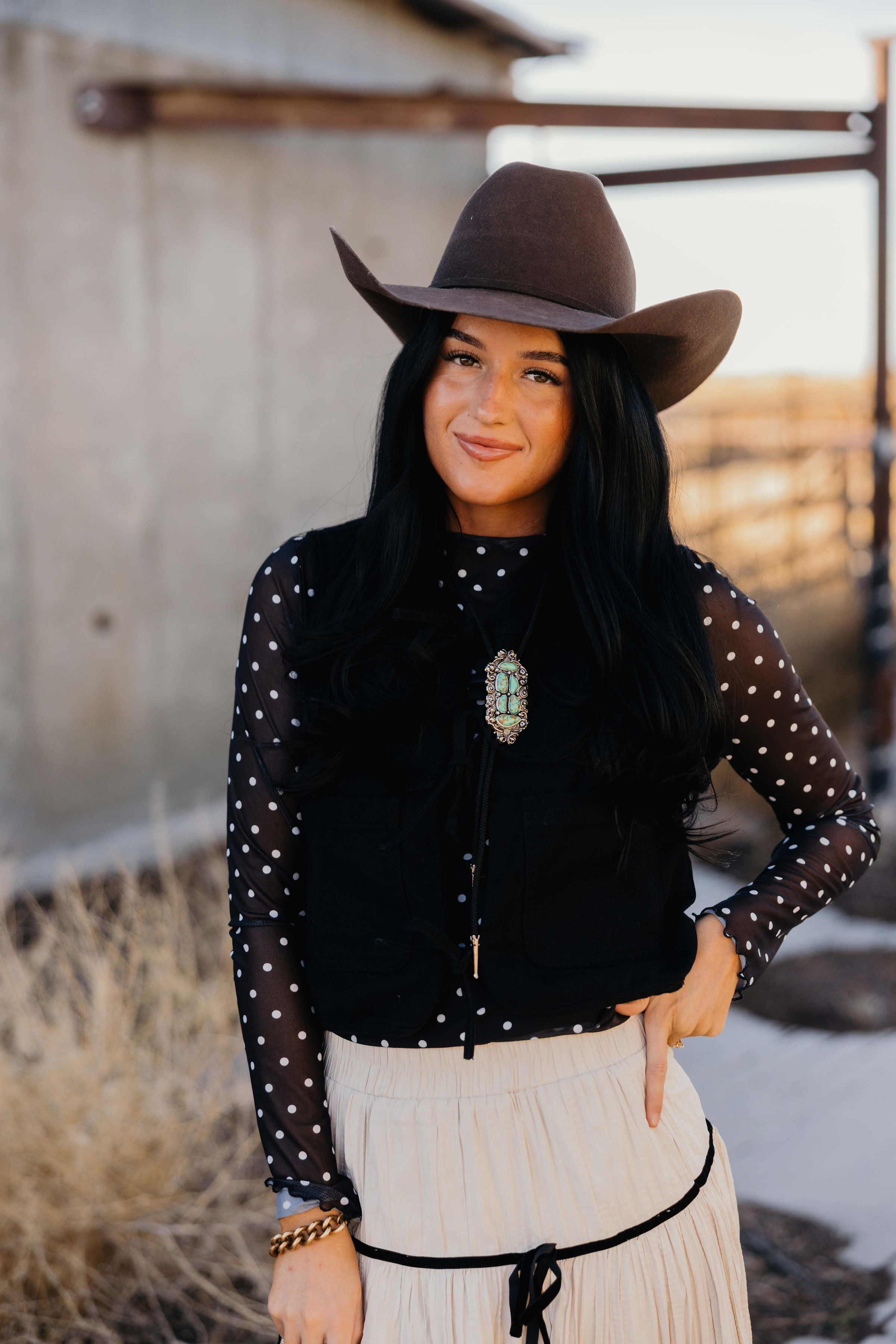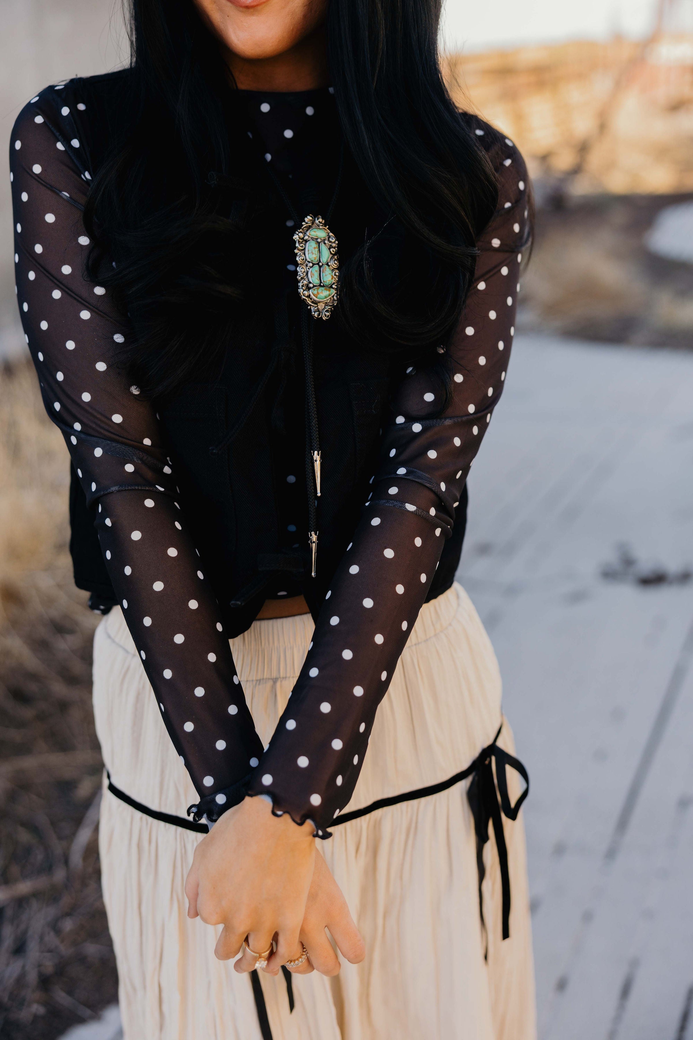 The Sowan Mesh Top features a black sheer mesh fabric adorned with timeless polka dot print. Designed with long sleeves and delicate lettuce trim, this fitted top offers an elegant silhouette perfect for layering. Ideal for winter, it adds a refined touch to any outfit while providing lightweight warmth and subtle texture.