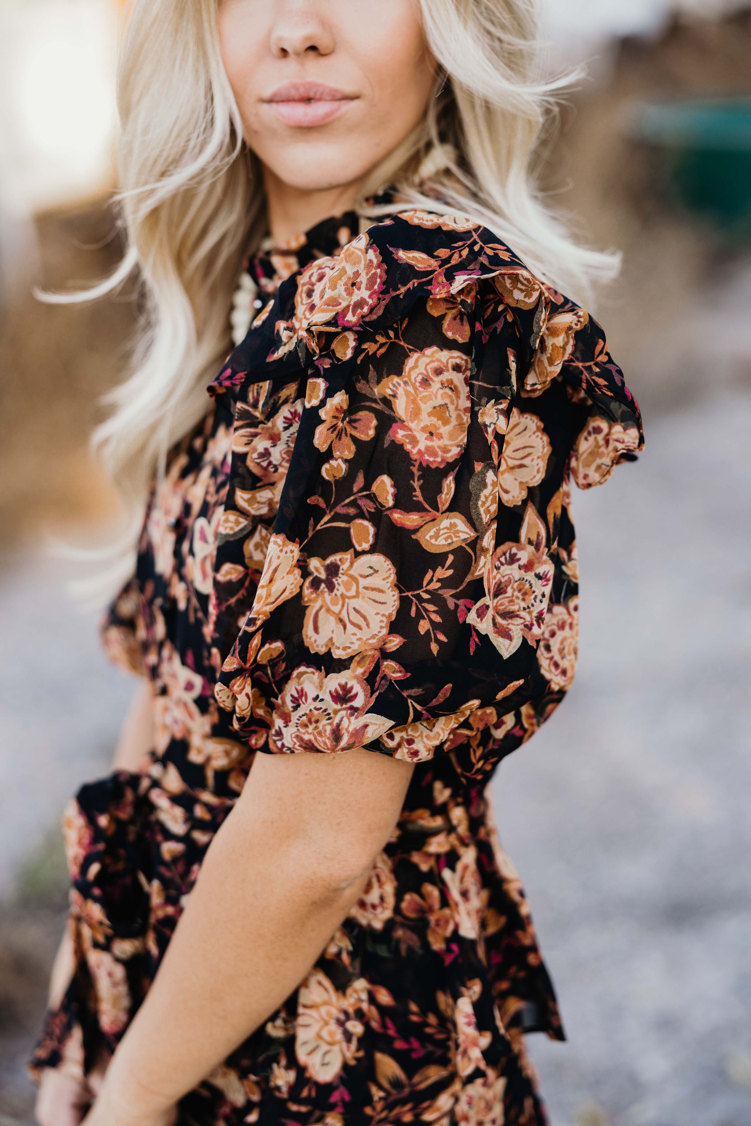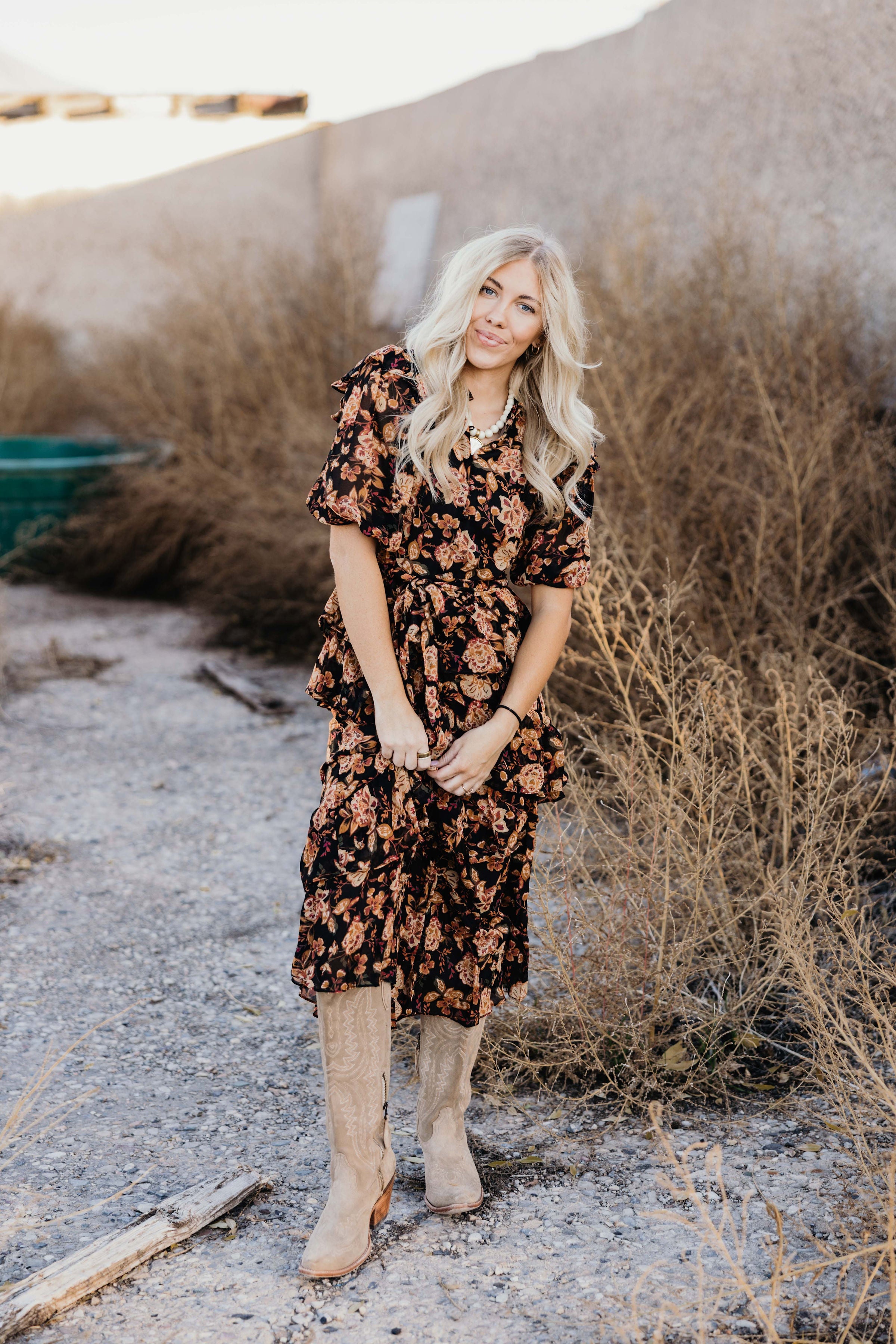 The Teagan Dress captures sunset vibes with its playful ruffle tiers and short balloon sleeves. This western inspired midi dress features a button down placket and a detachable belt to highlight your waist just right. Fully lined for cozy winter wear, it combines flirty details with comfort perfect for turning heads from day to night.