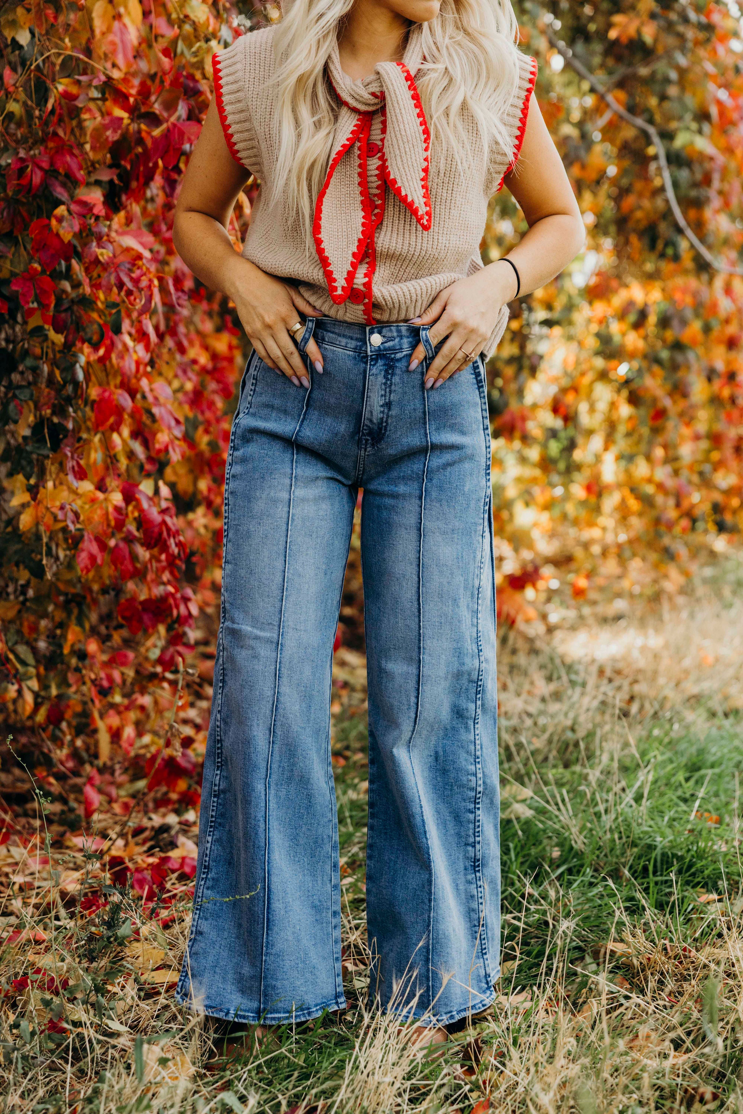 The Tinlee Jeans feature a flattering high-rise fit and a wide-leg silhouette, crafted from medium light wash denim for versatile style. Detailed with a distinctive middle seam and unique back pocket accents, these western-inspired jeans bring a fresh edge to your fall wardrobe. Perfect for those seeking comfort without sacrificing fashion, they pair effortlessly with your favorite seasonal layers.