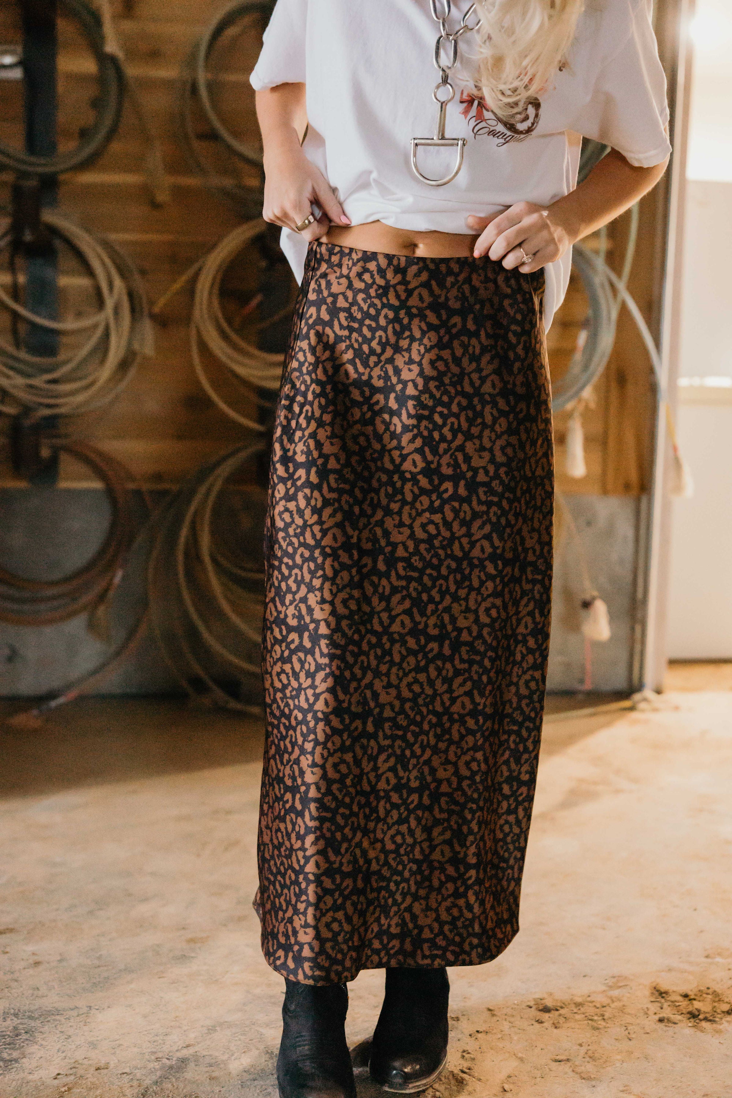 The Lawrence Skirt brings Western flair with a bold dark leopard print that commands attention. Crafted from luxurious satin, this skirt drapes beautifully while the elastic waist ensures all day comfort and an effortless fit. Perfect for adding edge to your everyday look or making a statement at your next night out.